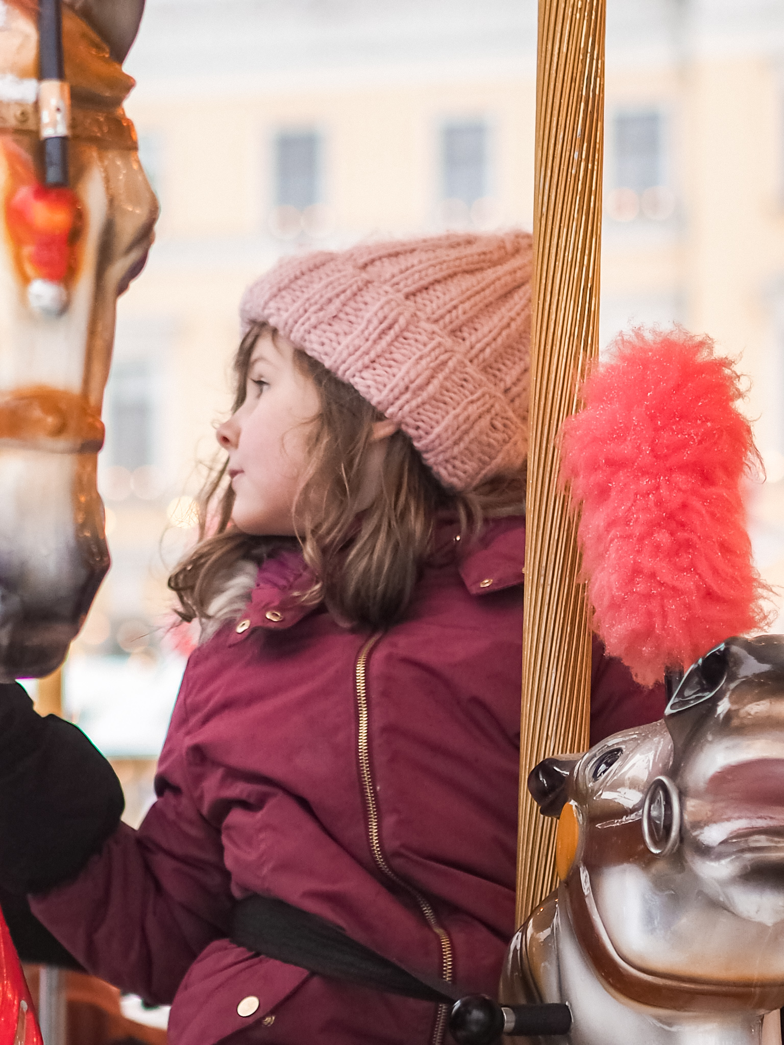 Vierailtiin markkinoilla itsenäisyyspäivänä. Lähdettiin liikkeelle hyvissä ajoin, koska lapsilla tuntui olevan melkoisesti virtaa. Lapset odottivat tietysti kaikkein eniten markkinoiden karusellia. Hurmaava, vanhanajan karuselli onkin lapsiperheiden vetonaula, sillä se tarjoaa maksuttoman kyydin kaikille lapsille ja lapsen mielisille. Karuselliin mahtui aika paljon porukkaa kerralla, joten vaikka jono oli aika pitkä, se meni nopeasti. Kumppani kiipesi lasten kanssa karusellin kyytiin varmistamaan ettei pienempi esimerkiksi putoa kyydistä. Minä pysyttelin ulkopuolella ja räpsin heistä kuvia muistoksi.