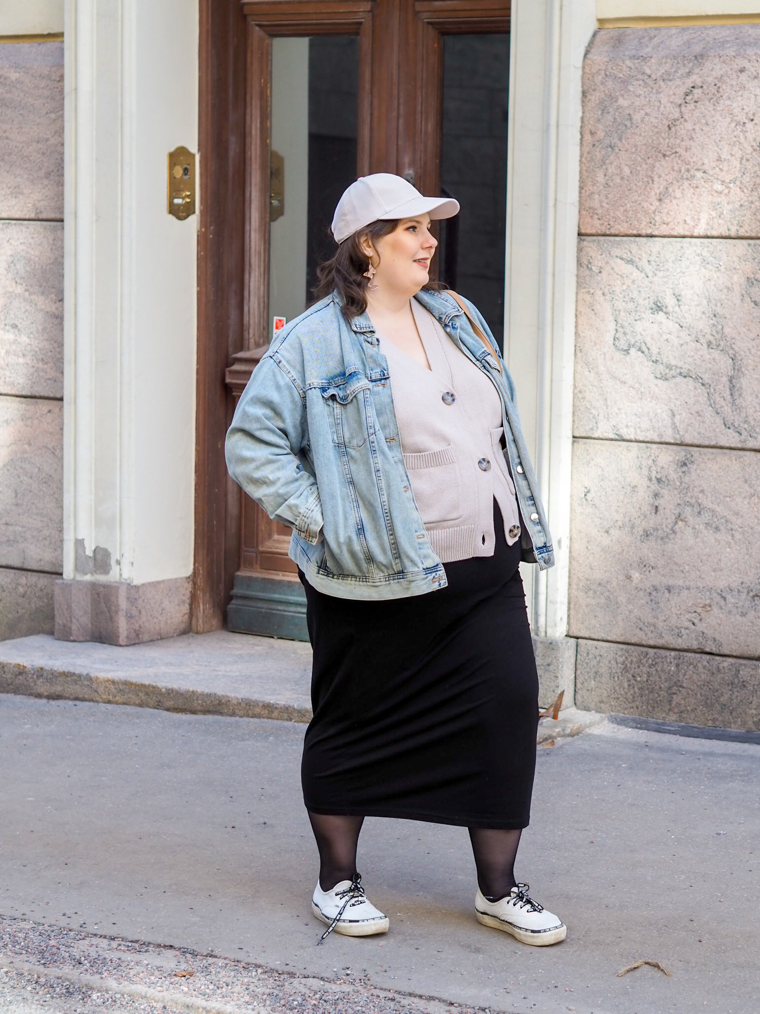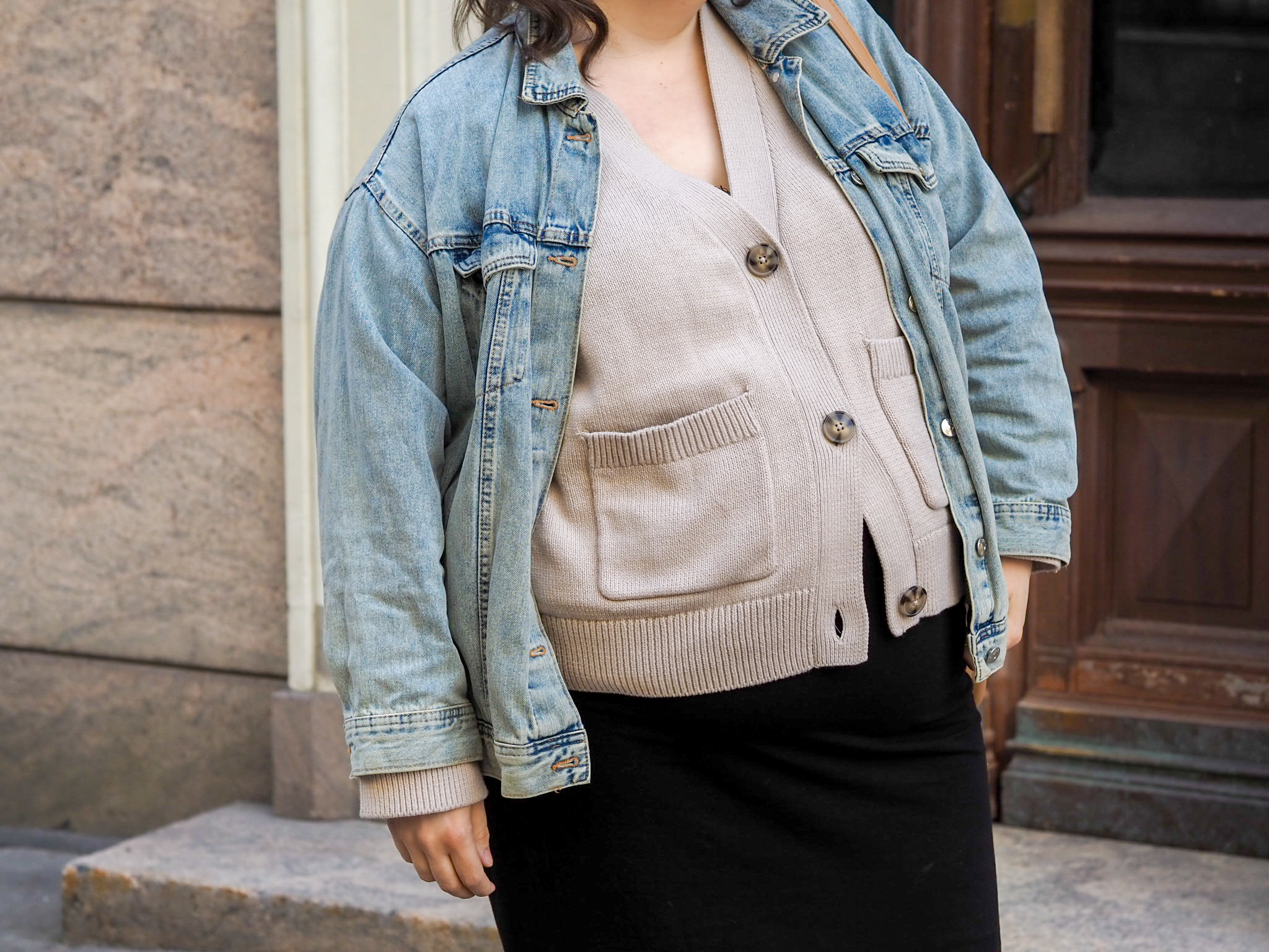Tässä asussa on useampia tämän hetken luottovaatteita. Tällä hetkellä pukeutuminen on koko ajan vahvemmin sitä, mikä mahtuu tällä hetkellä päälle. Tuo kuvissa näkyvä puuvillainen neuletakki on ollut ihan suosikkini. Alin nappi ei mene enää kiinni, mutta se ei haittaa. Sen väri on kiva. Se tuntuu hyvältä päällä ja sen malli on todella mieleeni. Se sopii vaatekaappiini kuin nakutettu ja yhteen kaikkien vaatteitteni kanssa. Mikä on ehdottomasti neutraalin, kapselimaisen vaatekaapin etuus.