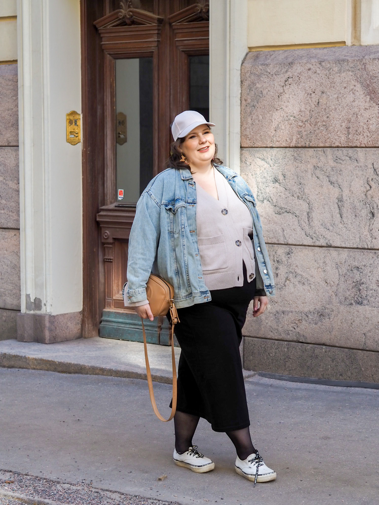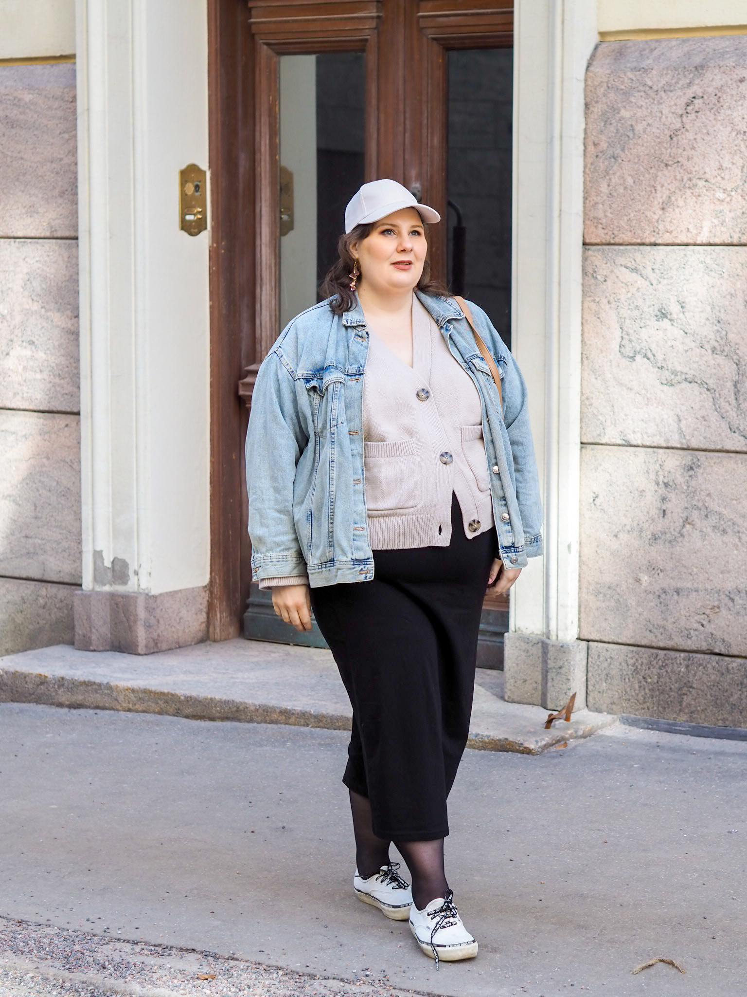Tässä asussa on useampia tämän hetken luottovaatteita. Tällä hetkellä pukeutuminen on koko ajan vahvemmin sitä, mikä mahtuu tällä hetkellä päälle. Tuo kuvissa näkyvä puuvillainen neuletakki on ollut ihan suosikkini. Alin nappi ei mene enää kiinni, mutta se ei haittaa. Sen väri on kiva. Se tuntuu hyvältä päällä ja sen malli on todella mieleeni. Se sopii vaatekaappiini kuin nakutettu ja yhteen kaikkien vaatteitteni kanssa. Mikä on ehdottomasti neutraalin, kapselimaisen vaatekaapin etuus.