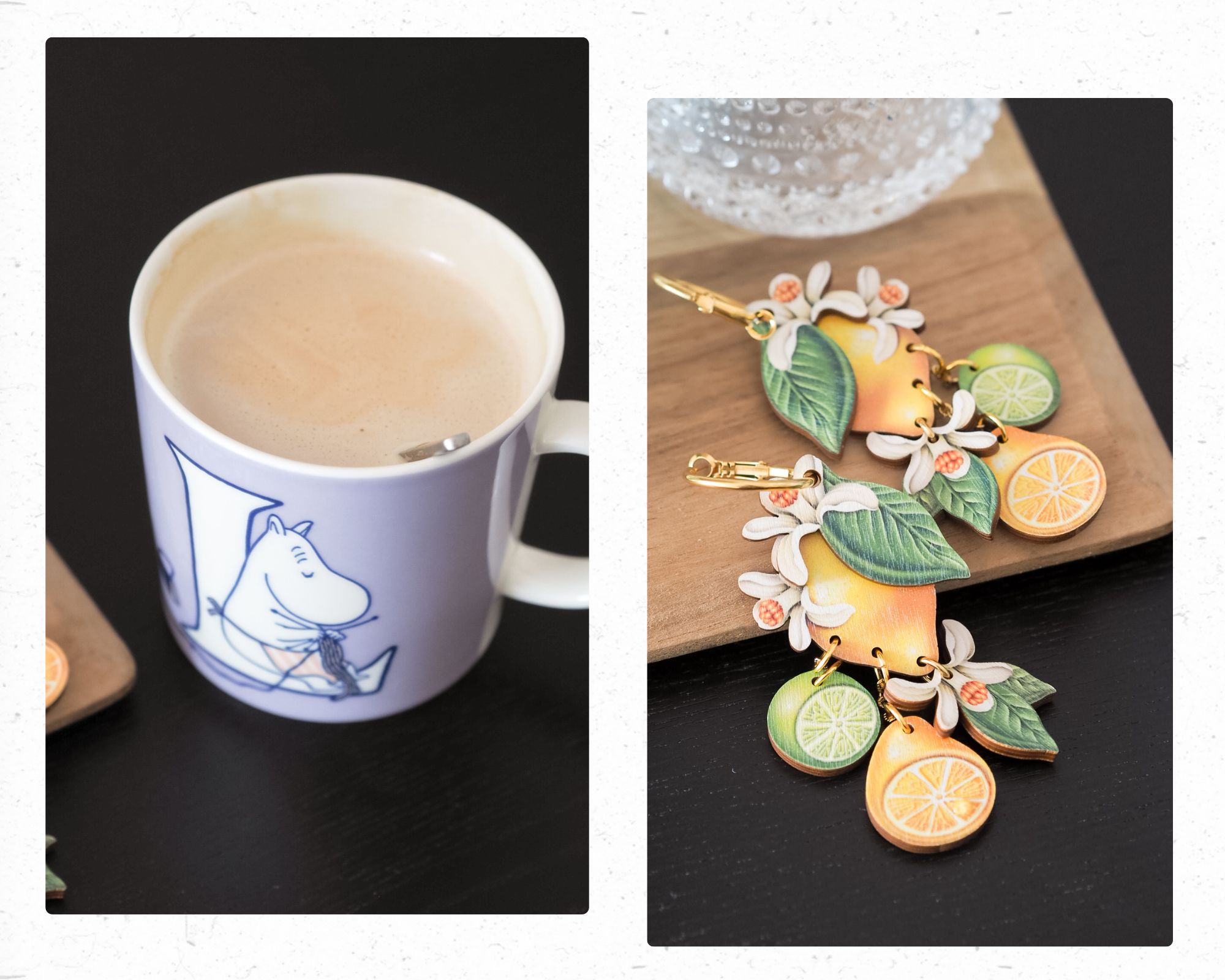 Me oltiin vähän juteltu etukäteen siitä mitä toivon. Kielsin puolisoani ostamasta mitään monen sadan euron lahjoja ja esitin yhden täsmätoiveen. Tämä täsmätoive oli kuvissa näkyvät Design by Kieto Sitrus-korvakorut. Bongasin nämä ensimmäisen kerran Iinalla ja ovathan nämä aivan ihanat.
