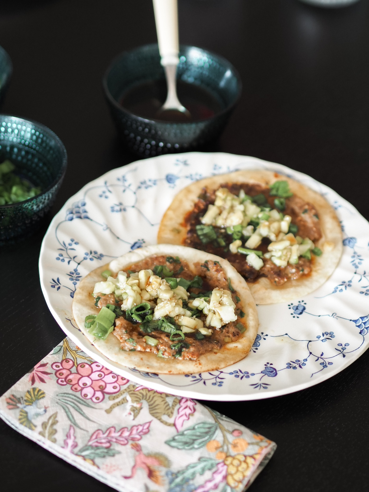 Mutta jaan teille seuraavaksi reseptin, johon me ihastuttiin Toten kanssa kertaheitolla. Tässä ovat dumblings tacot. Bongasin idean IG-reelsistä. Kyseisessä julkaisussa ei ollut koko reseptiä näkyvillä, joten minun piti hieman improvisoida. Onneksi tunnen jo sen verran hyvin aasialaistyyppisiä kastikkeita ja makumaailmoja, joten tämä ei ollut mikään ongelma. Kirjoitan nyt reseptin ylös, jotta voin itsekin palata siihen.