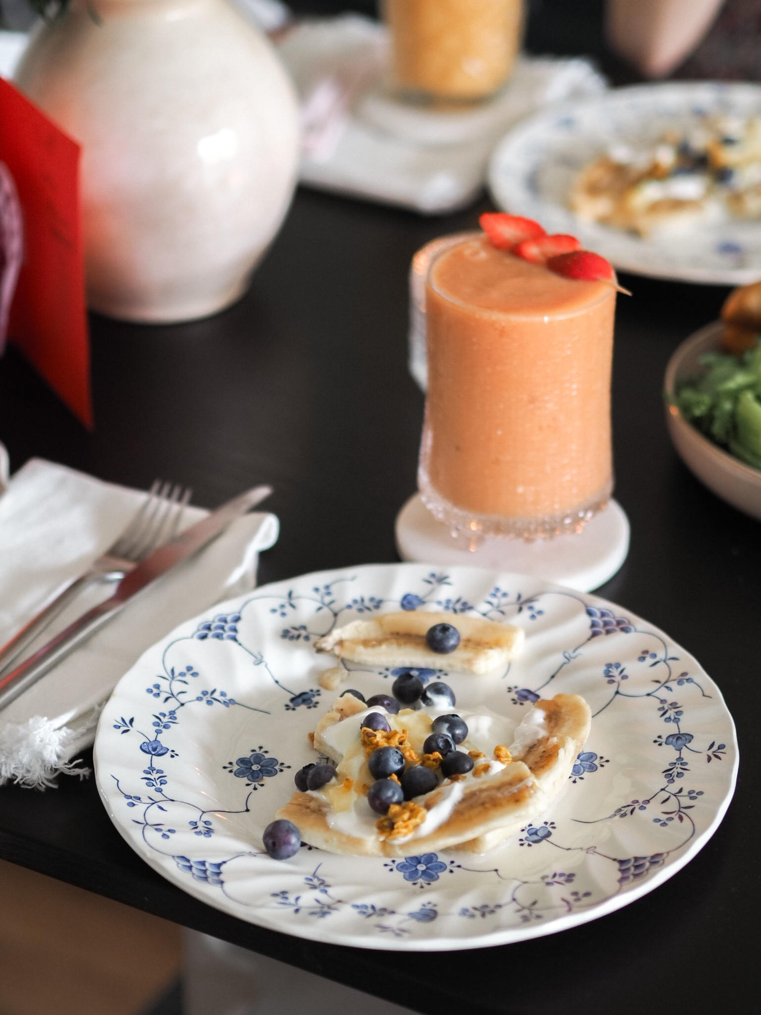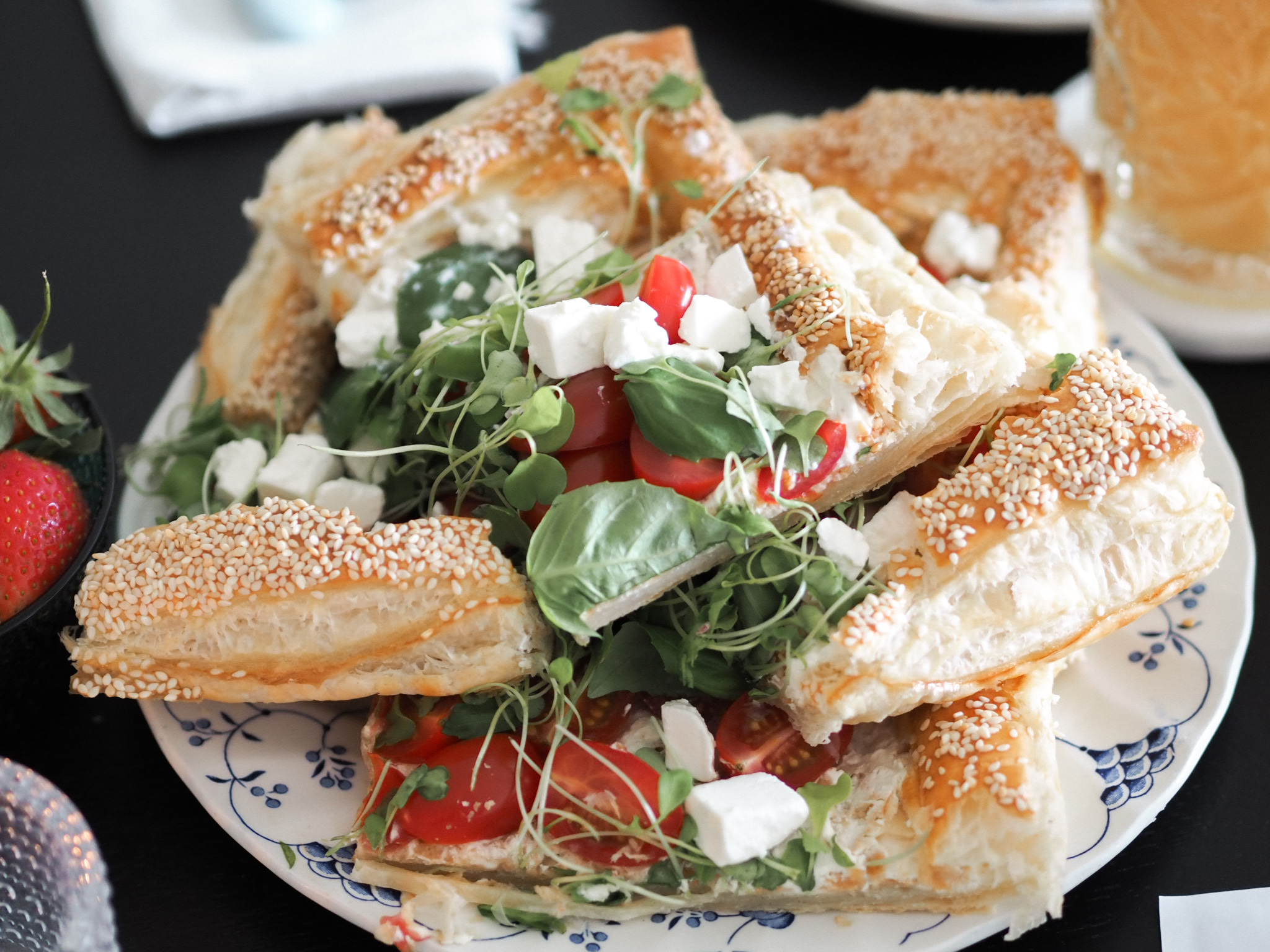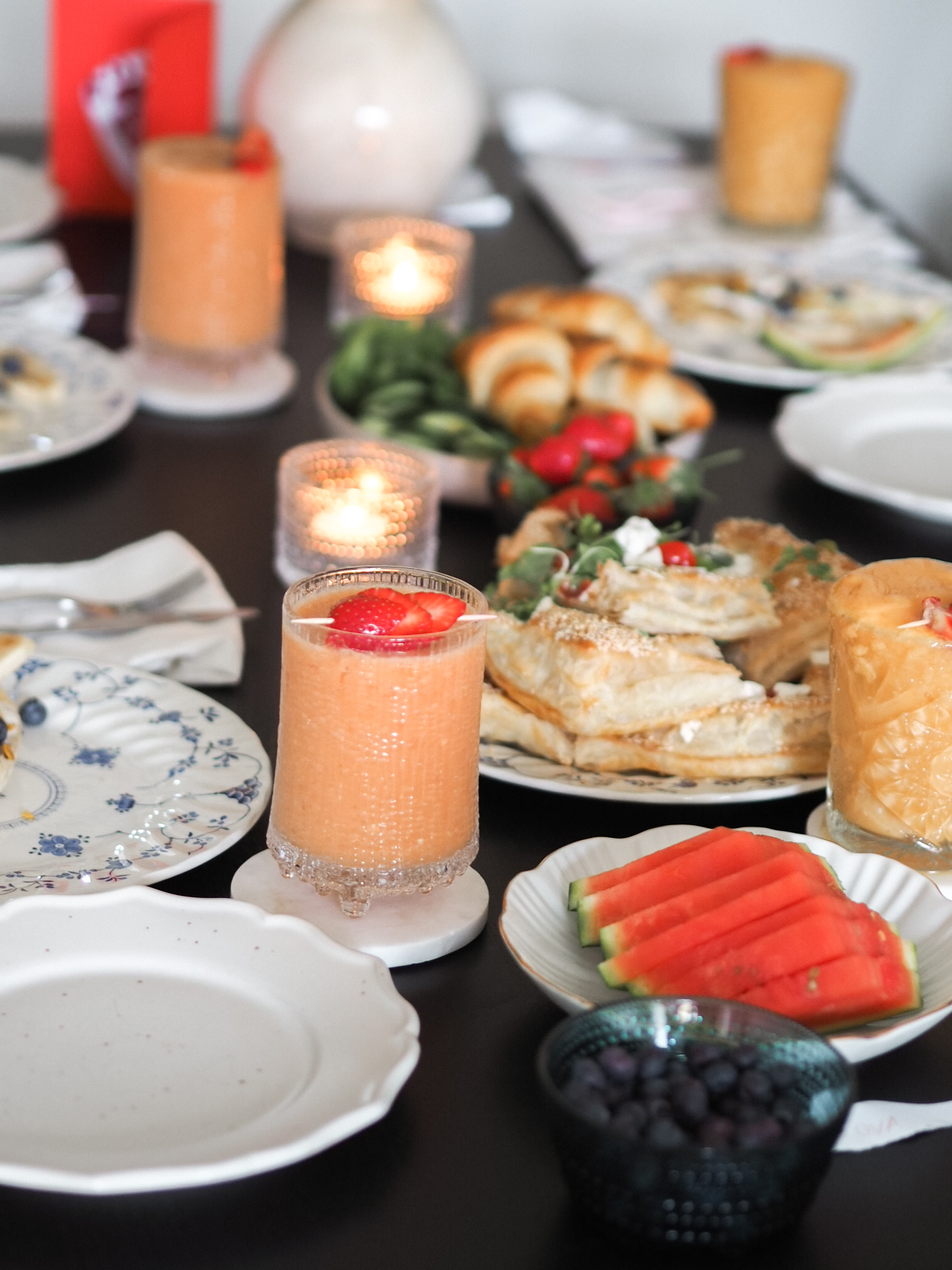 Meillä oli brunssipöydässä kreikkalaisestajugurtista, mustikoista ja granolasta tehty banana split, mielettömän hyvä fetapiirakka, smoothieta ja croisantteja. Pöydässä oli myös marjoja, mutta ne katosivat aika nopeasti lasten suihin.
