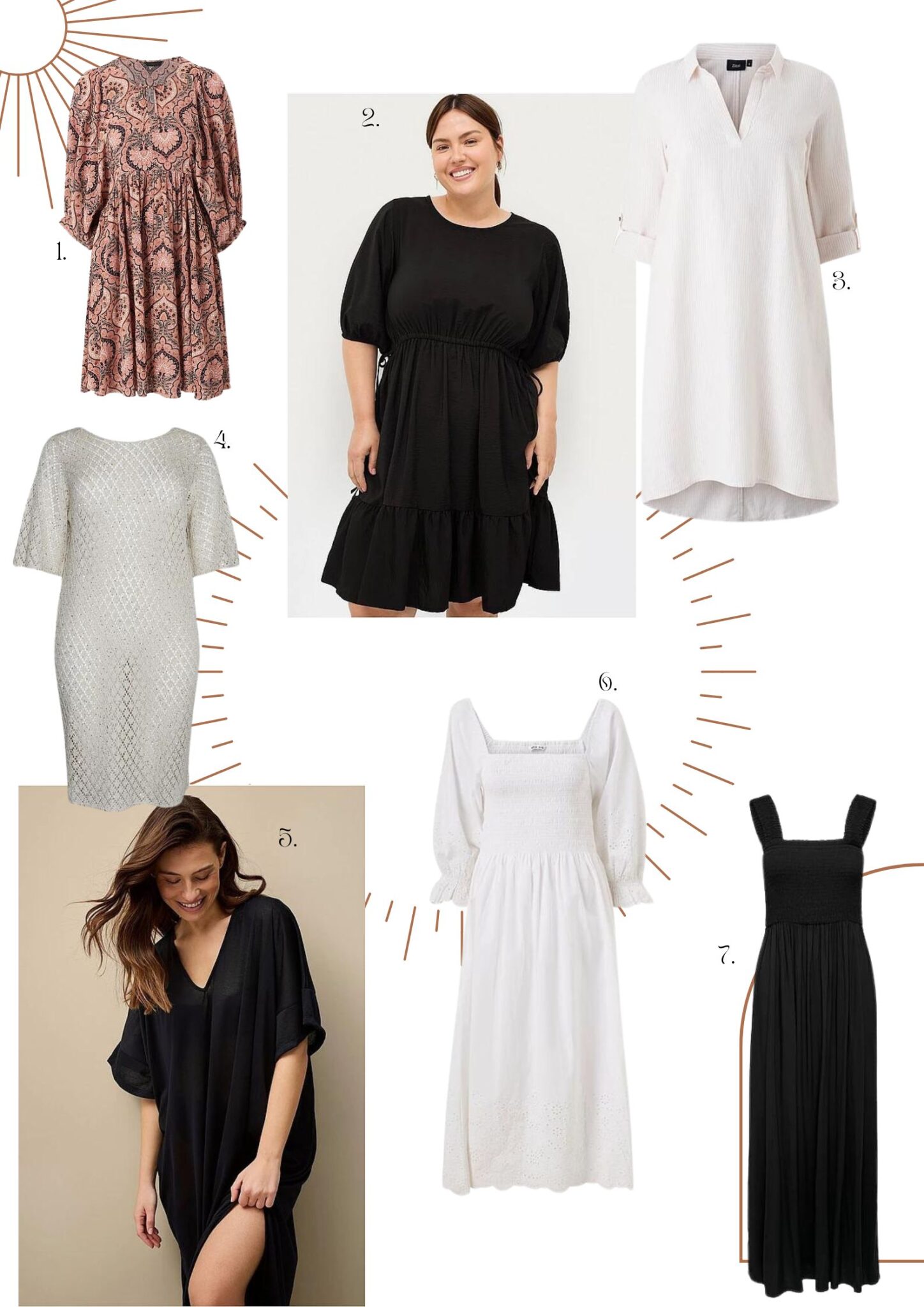 1. Fiona mekko* / 2. Vanja mekko* /3. Zizzi paitamekko* / 4. Cleilani mekko* / 5. Rantamekko Nyla* / 6. Mekko Alicia* / 7. Maximekko*