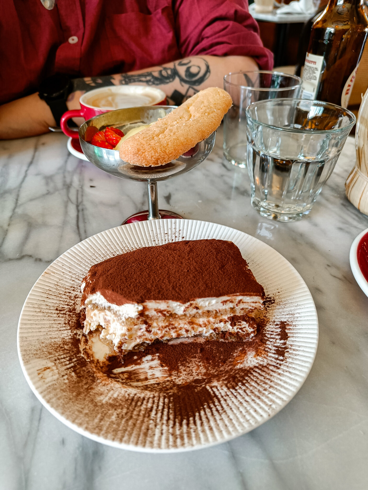 Päädyttiin tilaamaan listalta Bella Notte menu kahdelle. Menu sisälsi burrattaa ja bruchettaa, pääruuaksi pizzaa ja gnoccheja, sekä jälkiruuaksi gelattoa ja tiramisua. Ei ehkä oltaisi tilattu kovinkaan montaa näistä, mutta tässä ne tulivat menun mukana. Minä ihastuin burrataan ja gnocchi annokseen. Gnocchit olivat jotain uskomattoman hyvää. Olisin voinut syödä niitä huomattavasti enemmän. Sen lisäksi tilaan todella usein ravintolassa tiramisun ja täällä se oli aivan erityisen hyvää.