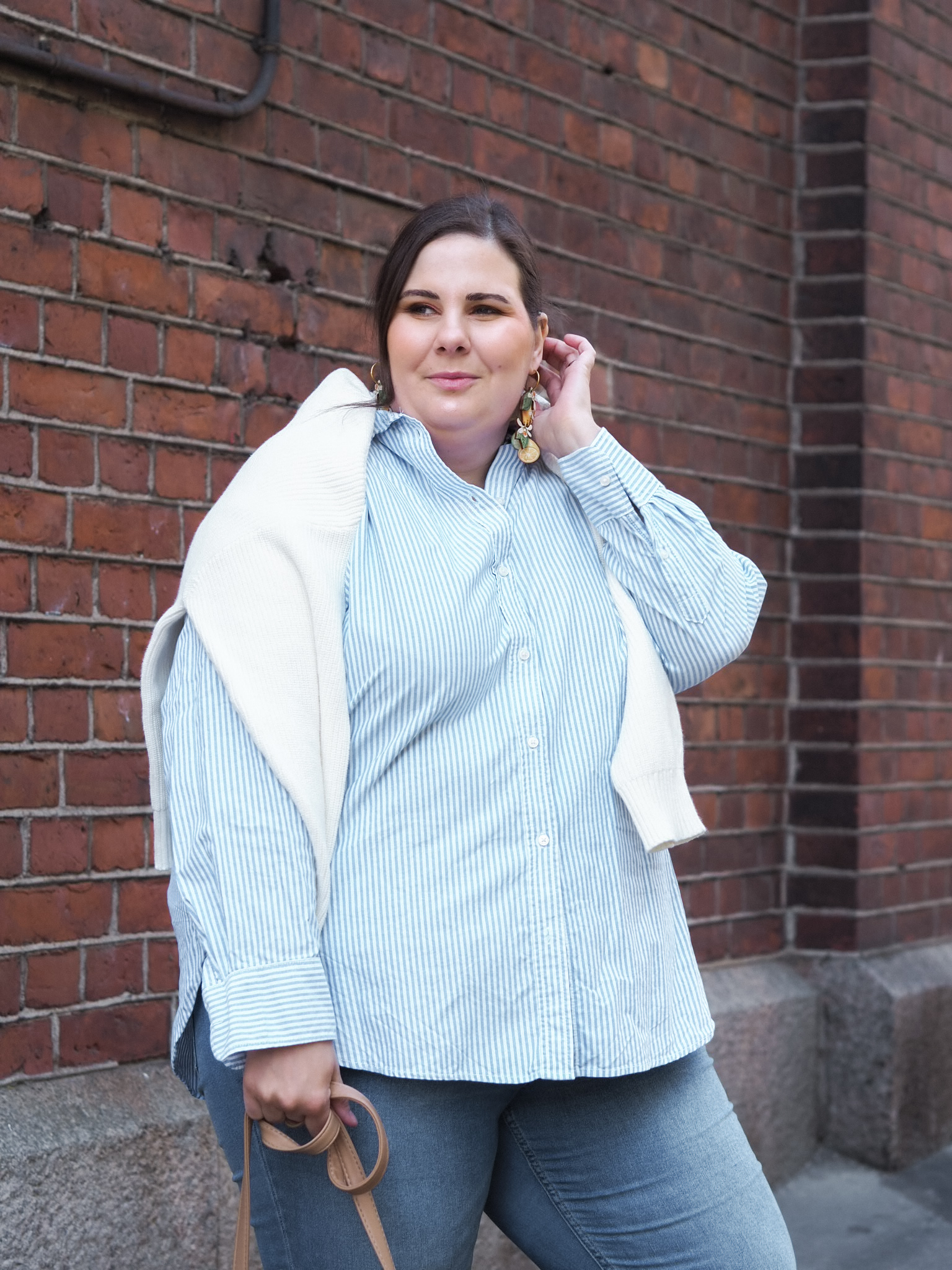 Tämä asu menee mittapuullani siihen klassiseen päähän. Viihdyn tässä todella hyvin. Ostin tuon paidan synnytyksen jälkeen, kun kaipasin vaatekaappiin lisää kauluspaitoja, jotka palvelivat sitä imetyksen alkutaivalta. Toki katsoin sellaisia vaatteita, joita käyttäisin myös ihan muutenkin ja tämä on kyllä sellainen. Yhdistän kauluspaidat kaikkein mieluiten hameisiin tai sitten farkkuihin, kuten tässä. Ja siis, mihin milleniaali pillifarkuistaan pääsisi? No ei mihinkään.