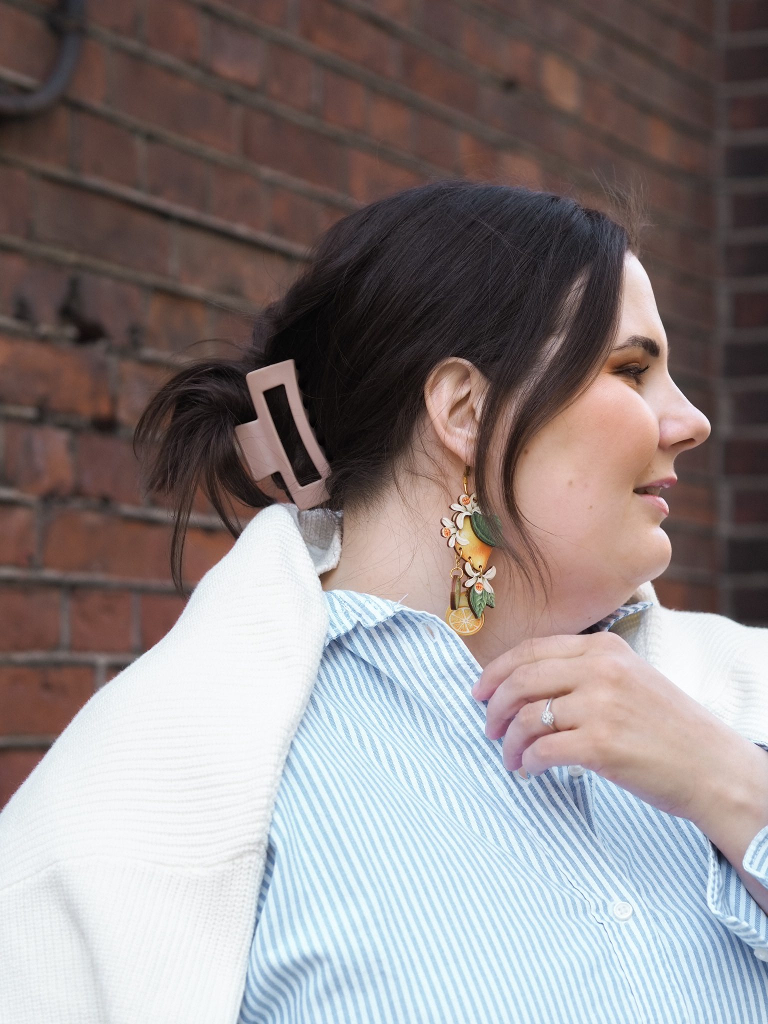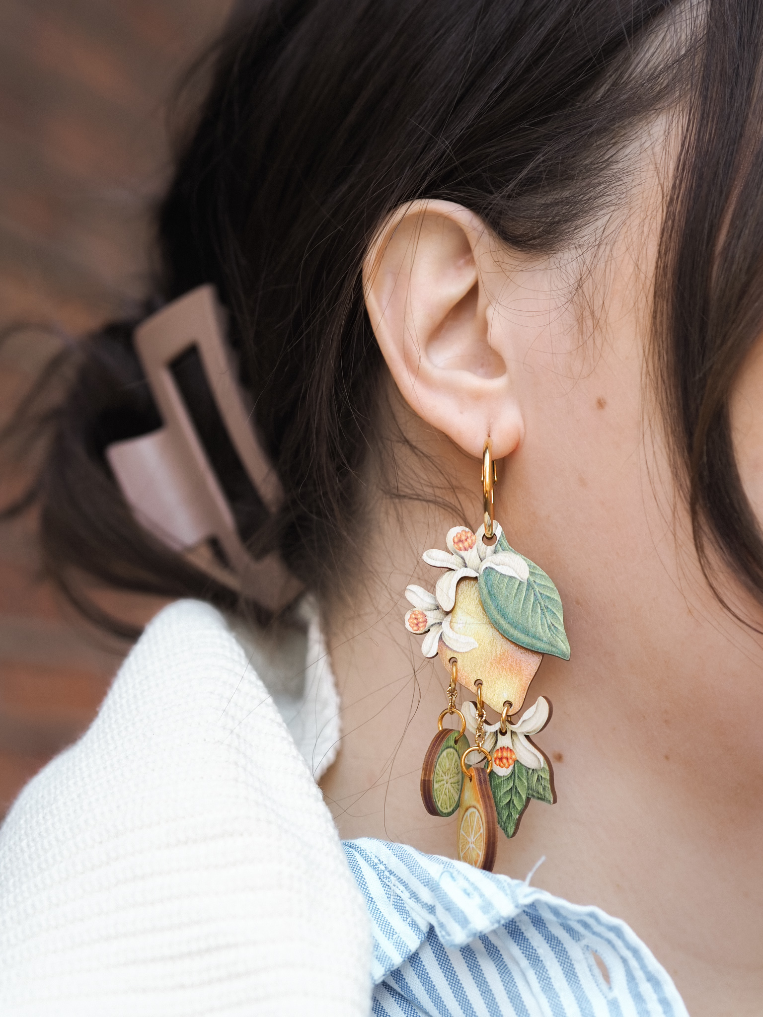 Kuvissa näkyvät sitruunakorvikset ovat viime vuoden syntymäpäivälahja Totelta. Viime kesänä eivät päässeet hirveän usein käyttöön, mutta kesäkuussa niitä on käytetty kyllä senkin edestä. Ne ovat kotimaisen Design By Kieton sitrus-korut. Taisin nähdä nämä ensimmäisen kerran Iinalla. Se oli rakkautta ensi silmäyksellä. Onneksi Totte otti vinkistä vaarin.