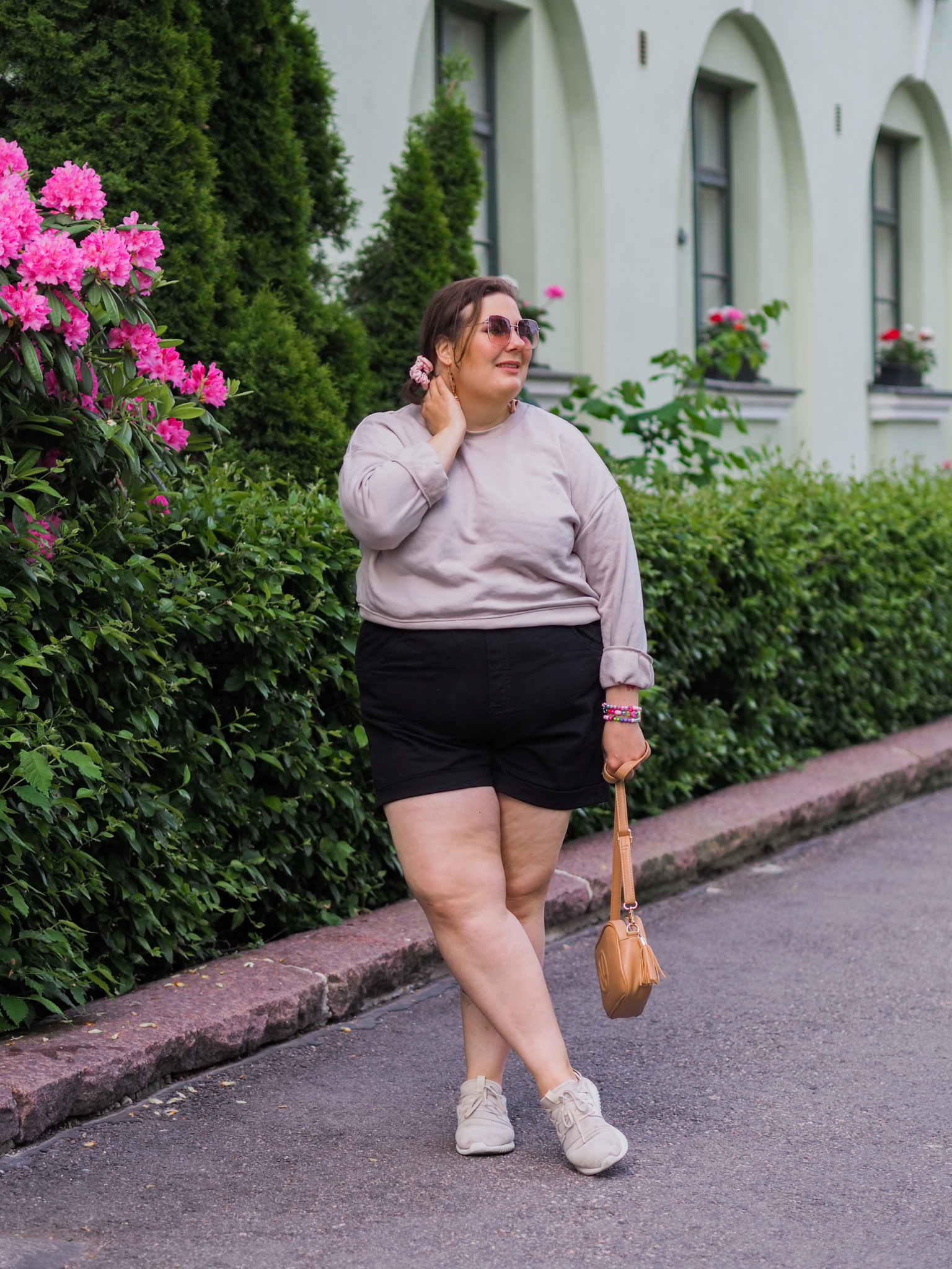 Tämä on ehkä yksi suosikki asuistani, mitä olen blogiin julkaissut. Pidän sen yksinkertaisuudesta ja rentoudesta. Tuona kesänä innostuin myös uudelleen shortseista. Olin ollut aiemmin niin epävarma kehostani, että shortsien pukeminen ei ollut tullut aiemmin kuuloonkaan.Tuolloin lopetin viimein jalkojeni häpeilyn ja puin shortsit jalkaan. Kaikki vaatekappaleet löytyvät minulta edelleen. Tosin en tiedä mihin nuo aurinkolasit ovat joutuneet. Ne ovat aivan ihanat. Pidän niistä todella. Ranteessa minulla on tässä muuten lasten tekemät rannekorut.