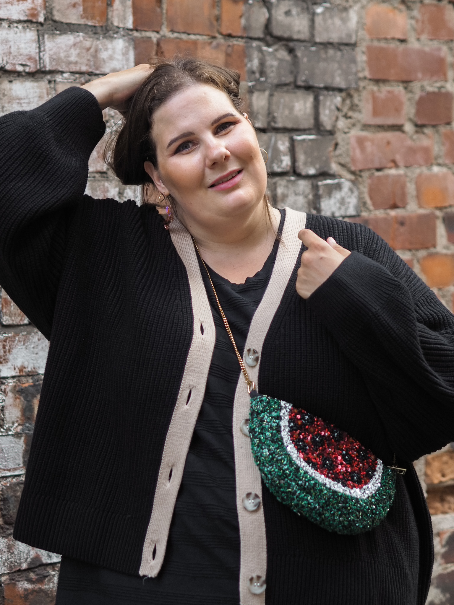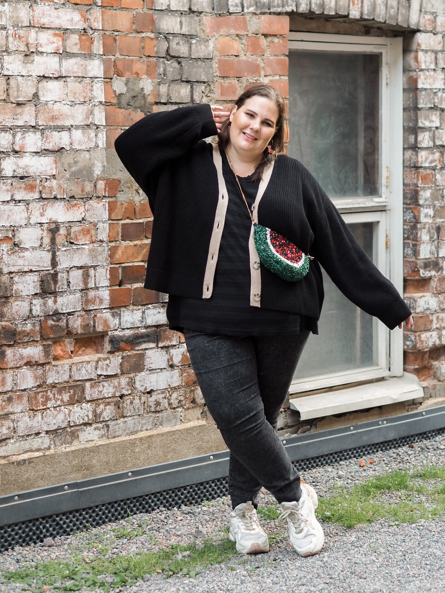 Hyvänä esimerkkinä siitä istuvuudesta on tuo neuletakki. Se on omaa kokoani ja oikeasti hieman over size. Tuntuu, että kun keskikokoisten kaavoihin on vaan lisätty sitä pluskokoa, vaatteet ovat joko juuri sopivan kokoisia tai kinnaavat jostain kohtaan. Tämän pluskoossa alunperin suunnitellun neuleen kanssa ei ollut sitä ongelmaa. Ja tätä ilahtumisen määrää voi ymmärtää vain toinen, joka on kokenut samoja ongelmia vaatteiden etsinnässä.