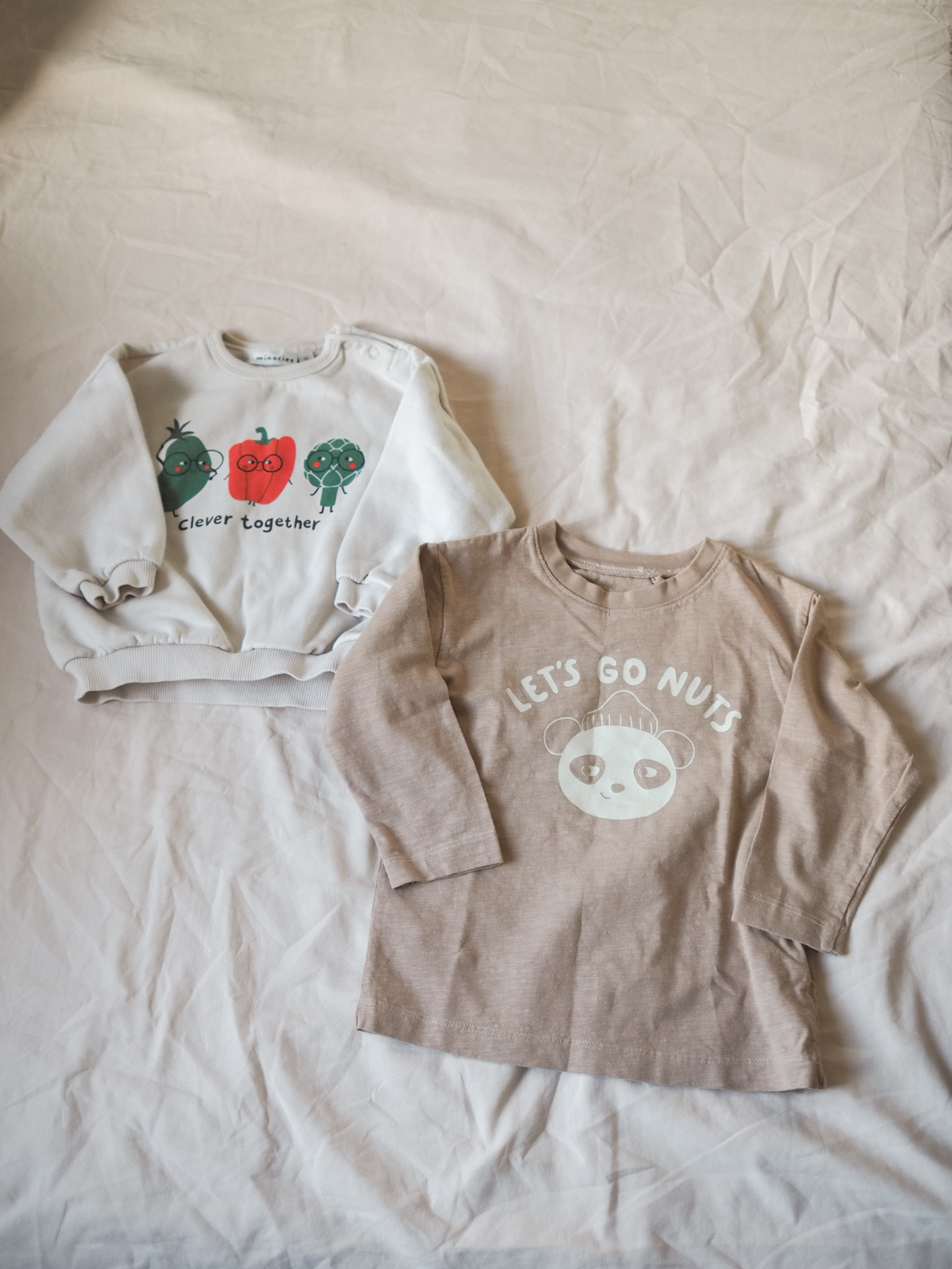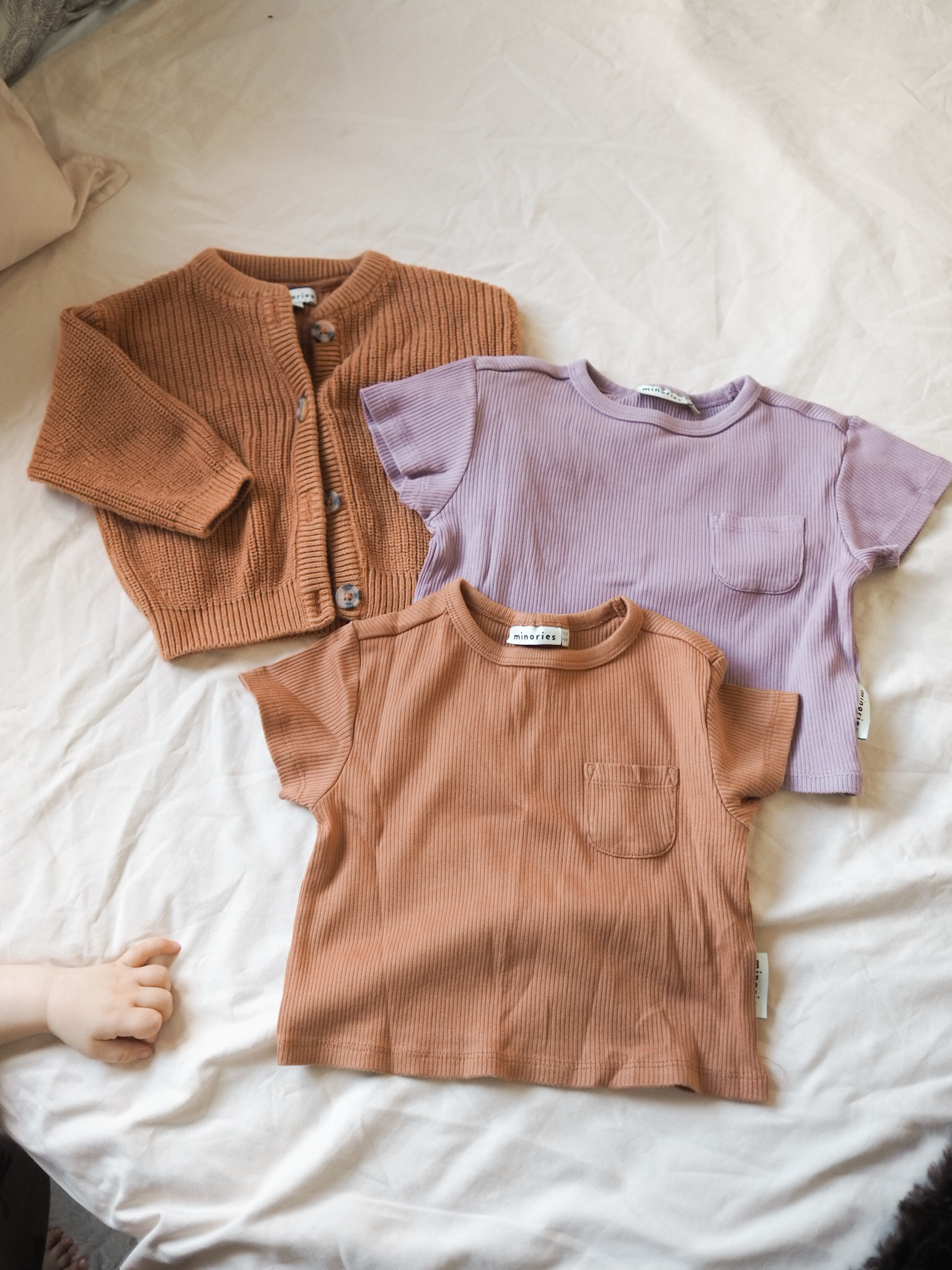 Ihastuin noin vuosi sitten Minories nimiseen lasten brändiin. Tämä brändi on ilmeisesti KappAhlin alainen, kuten Newbie. Pidän valtavasti vaatteiden murretusta värimaailmasta ja hauskoista kuvituksista. Yllä olevassa kuvassa näkyy pari ribbipaitoja, jotka ovat olleet taaperon arkikäytössä ihan omia suosikkeja.