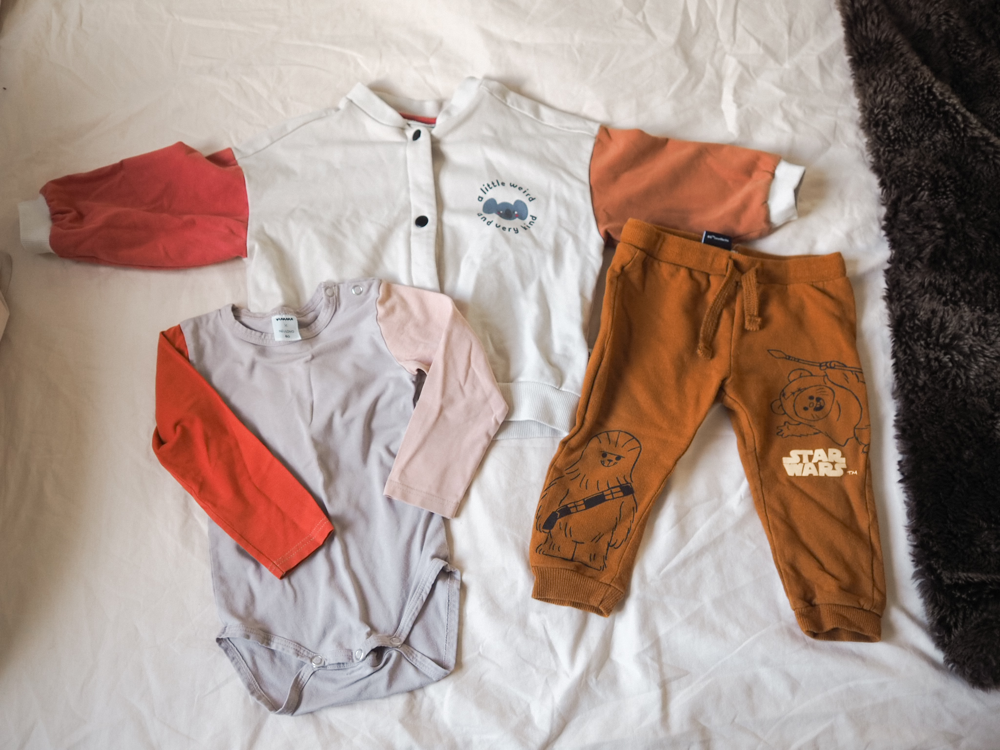 Alimmassa kuvassa näkyy nuo Star Wars teemaiset pöksyt, joista iskä on aivan innoissaan. Totte on kova Star Warsin fani, joten tällainen vintedlöytö miellyttää myös isän silmää.