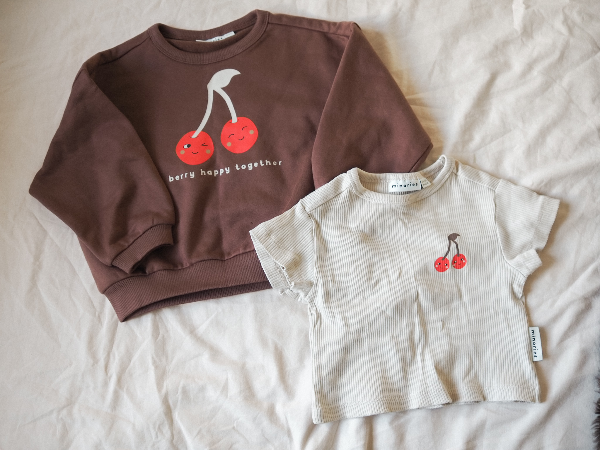 Ihastuin noin vuosi sitten Minories nimiseen lasten brändiin. Tämä brändi on ilmeisesti KappAhlin alainen, kuten Newbie. Pidän valtavasti vaatteiden murretusta värimaailmasta ja hauskoista kuvituksista. Yllä olevassa kuvassa näkyy pari ribbipaitoja, jotka ovat olleet taaperon arkikäytössä ihan omia suosikkeja.