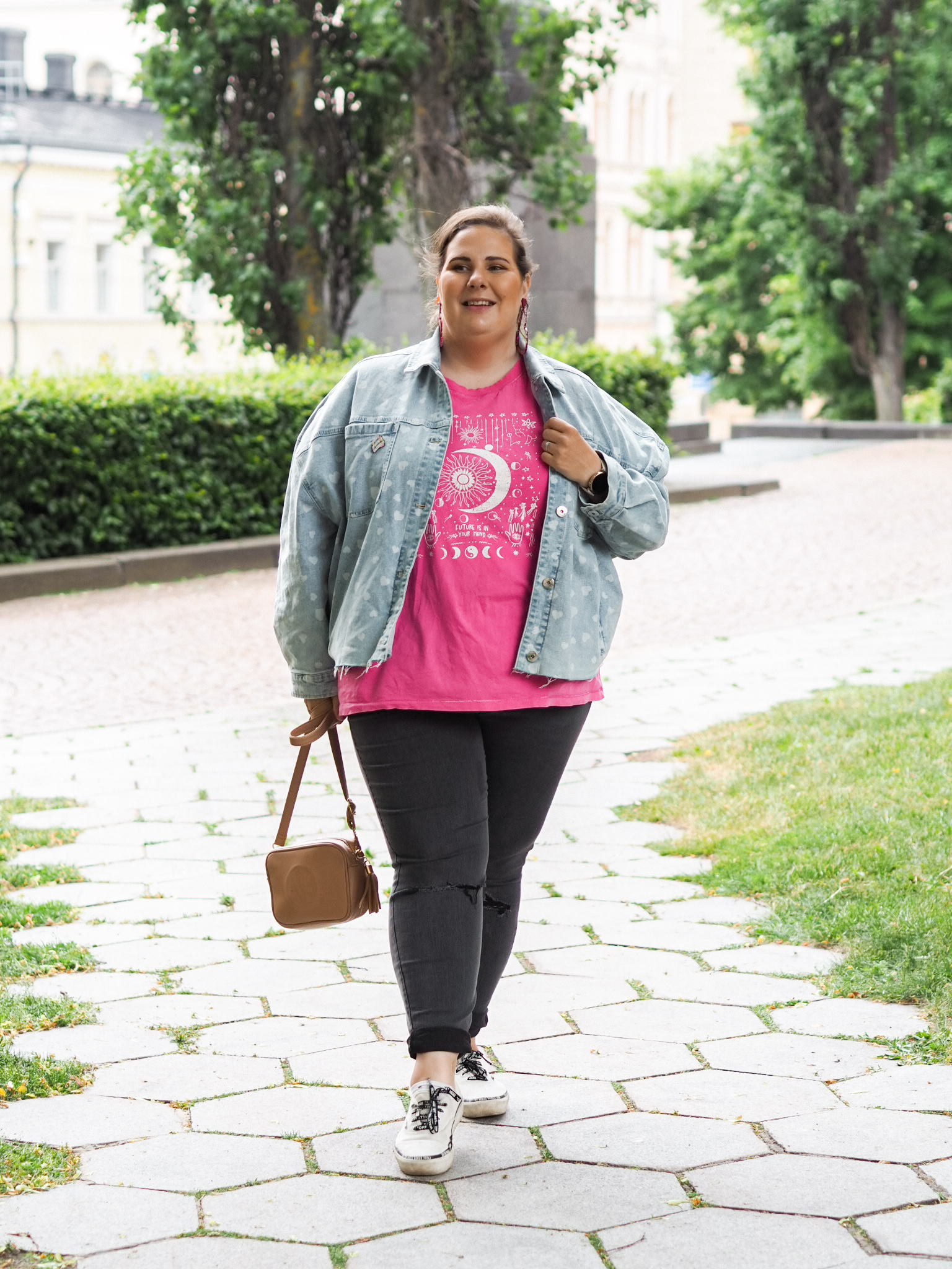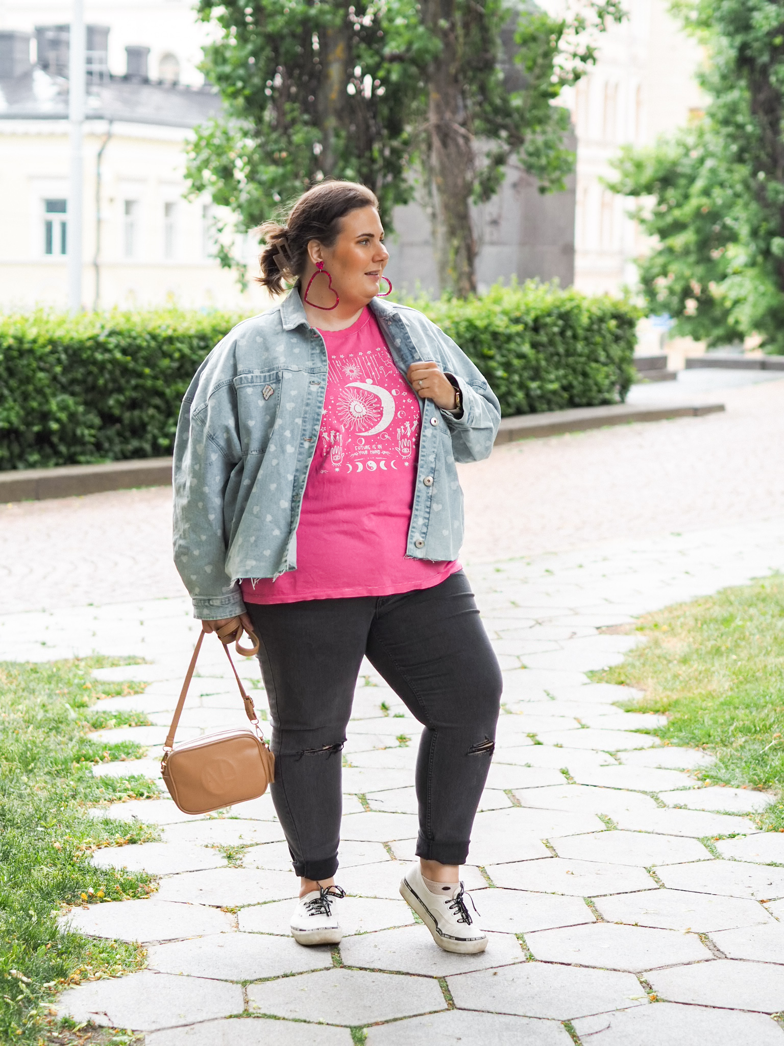 Asu itsessään on tosi rento ja kiva. Näin pukeudun yleensä arkena. Johonkin helppoon, kivaan yläosaan ja farkkuihin. Simppeliä ja toimii tosi hyvin. Kylmällä ilmalla yhdistän tähän jonkin neuletakin. Tuosta pinkistä paidasta on tullut mallinsa ansiosta toinen suosikeistani. Se toinen suosikki on saman mallin ja merkin eri värinen paita. Tämä on oikeasti sellainen löysä ja rento paita, jossa viihtyy. Nappaan sen aina päälle, kun se on saatu silitettyä. Ja koska väri on omaan väripalettiini aika kirkas, niin yhdistän tämän kaikkein mieluiten tummiin, istuviin alaosiin.