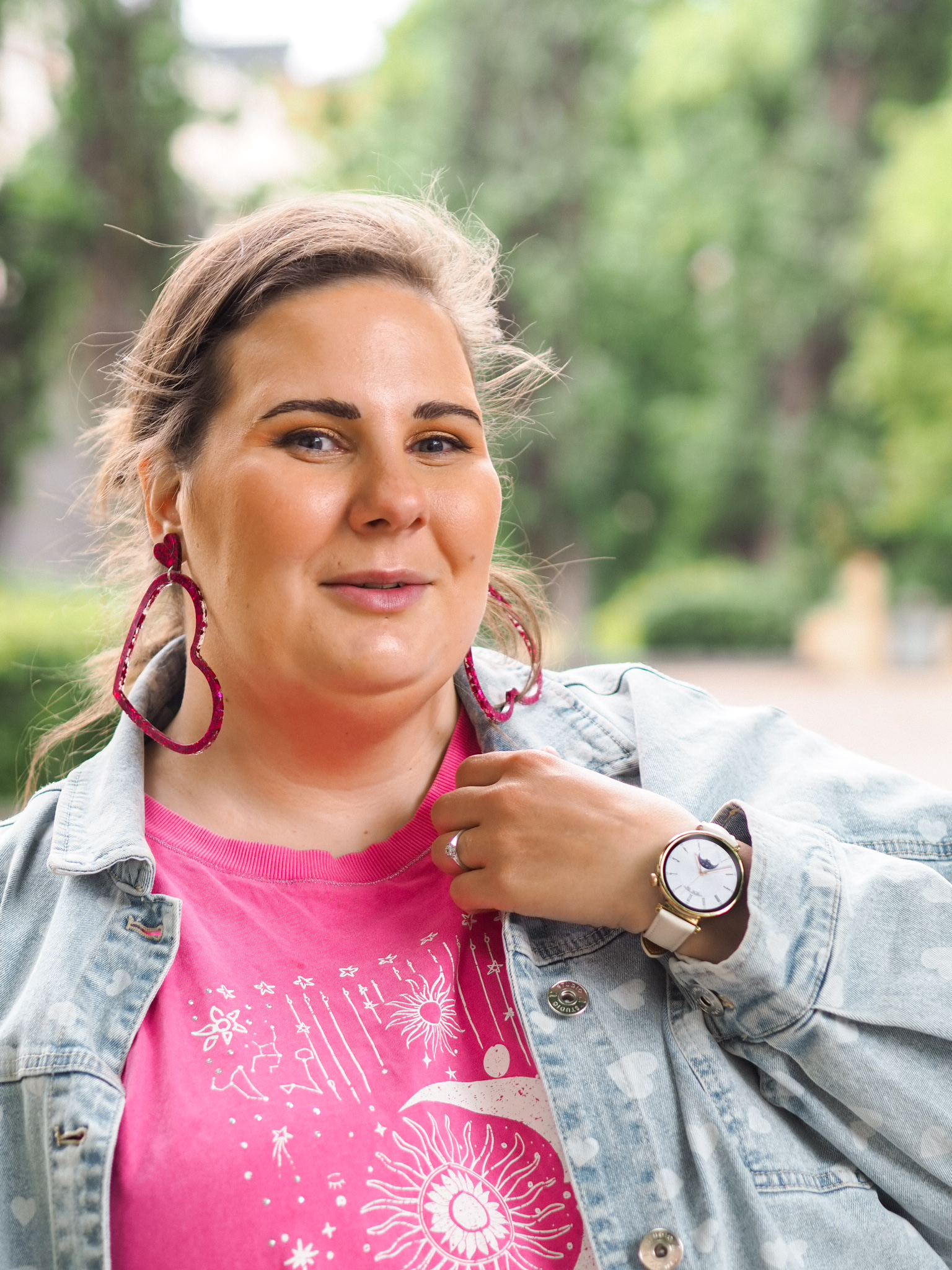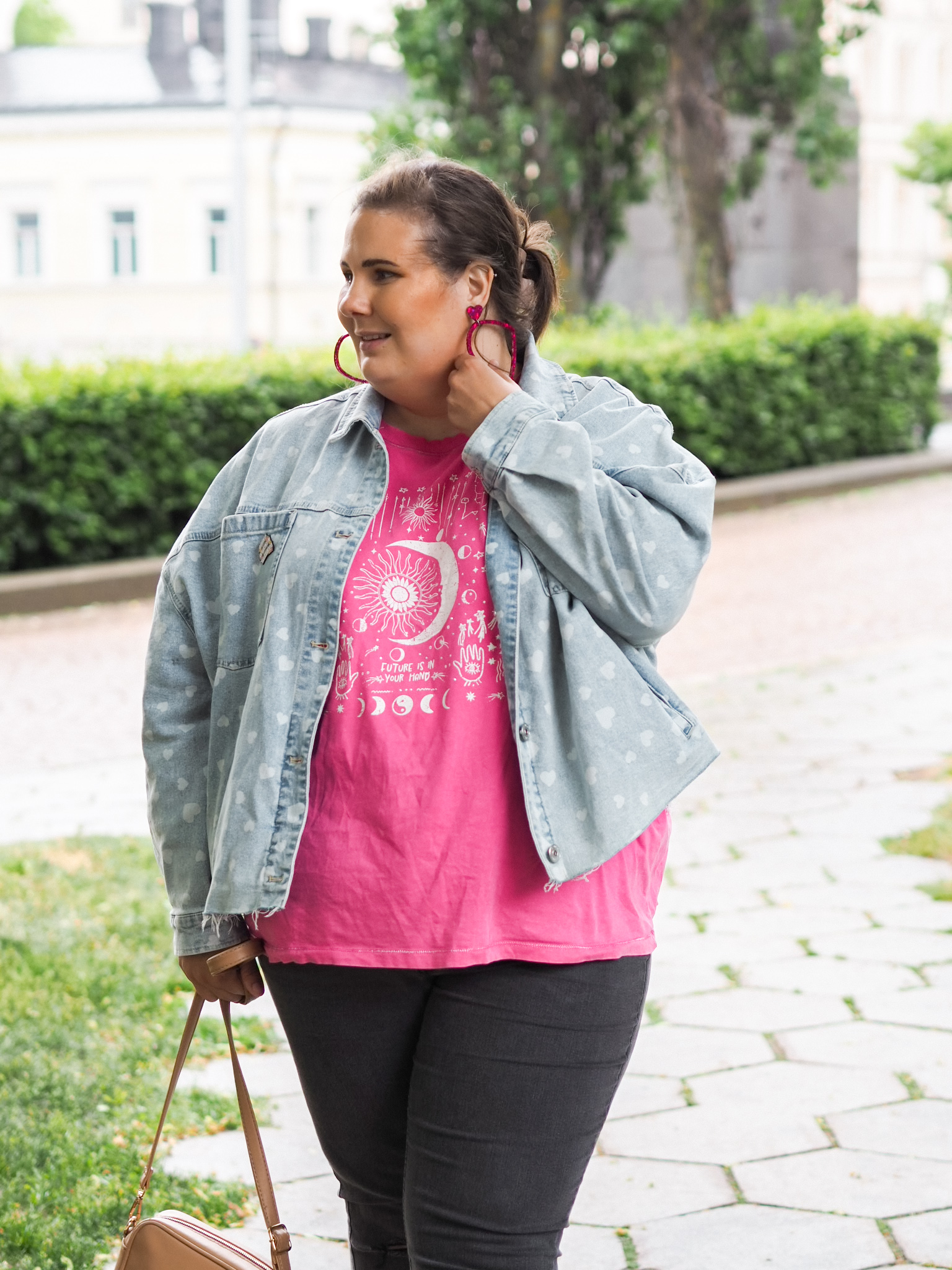 Takin ostin keväällä Ulla Popkenilta. Ihastuin todella paljon tuohon sydän printtiin joka siinä on. Sen ansiosta farkkutakki erottuu kivasti muista. Printti on kiva ekstra klassisessa takissa. Se on malliltaan reonto, oikeasti oversize ja vähän vajaamittainen. Tykkään myös tuosta leikatusta helmasta. Takki on myös tosi laadukas. Tämä oli ensimmäinen kerta, kun itse tilasin Ulla Popkenilta ja olin kyllä kaikin puolin tyytyväinen. Tilaaminen oli helppoa ja sivu neuvoo kivasti sopivan koon löytämisessä.