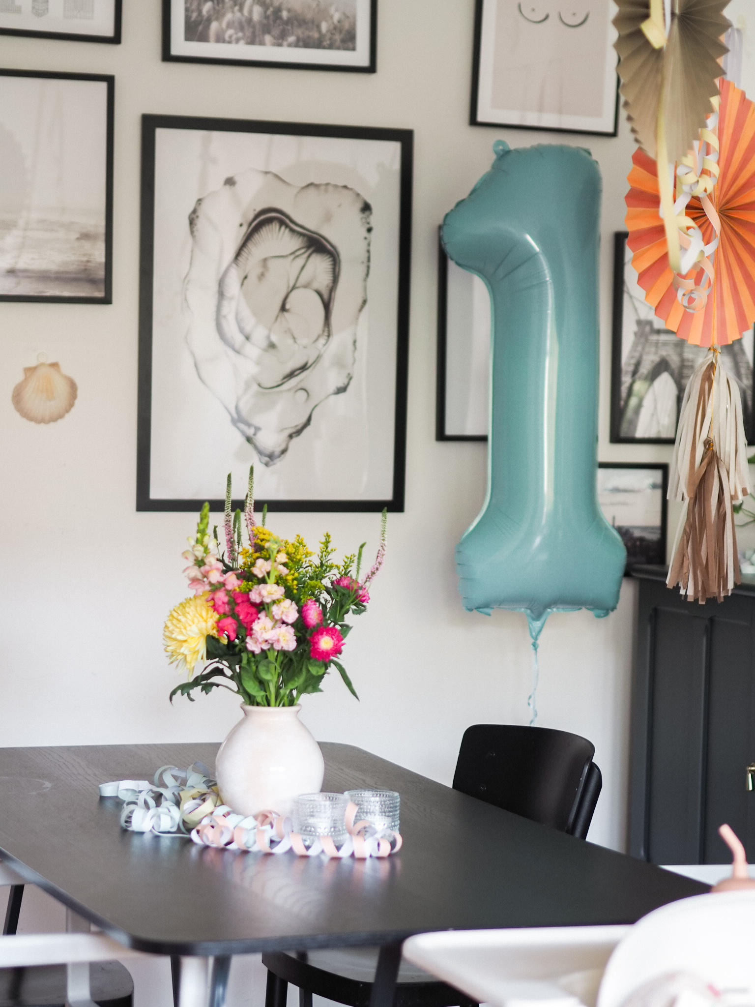 Todettiin, että koska taapero tuskin tulee muistamaan näitä juhlia, pidetään koristelu mahdollisimman minimaalisena. Toki tässäkin on jo jotain, mutta jätettiin esimerkiksi ilmapallot kokonaan pois. Meillä on ollut monissa juhlissa koristeena nimenomaan ilmapalloja. Niillä saa niin helposti tehtyä sitä juhlan tuntua.
