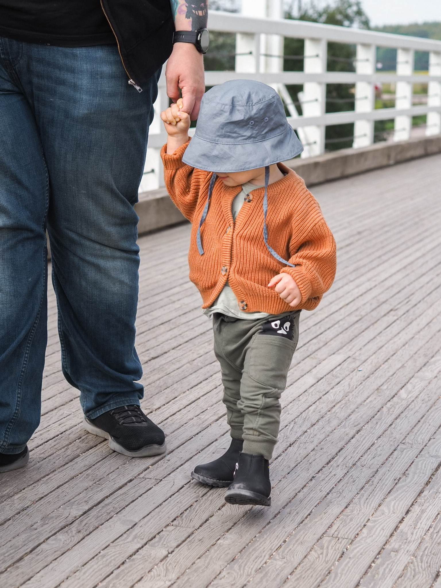 Taapero jaksoi retken hyvin. Hän jaksoi kävellä pitkiä pätkiä käsi kädessä meidän kanssa. Haluttiin myös antaa hänelle aikaa kävellä rauhassa, jotta tämä taito harjaantuu entisestään. Sisällä, ilman kenkiä mennään jo tosi lujaa. Ulkona, kenkien kanssa, askel on vielä haparoivampi. Mutta pikku hiljaa sekin alkaa sujua.
