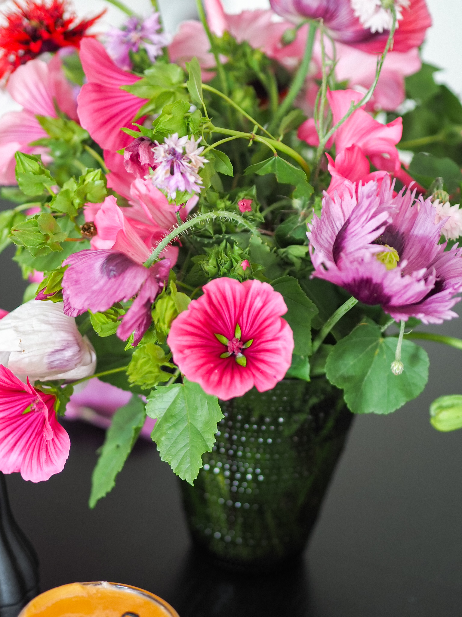 Kukat ehtivät varautumisesta huolimatta hieman nuutua matkalla, mutta ne virkosivat, kun sain ne aseteltua kotona maljakoihin. Nyt ne tuovat minulle taas aivan suunnatonta iloa. Vitsailtiin Toten kanssa siitä, että olen periaatteessa suht helppo nainen. Tulen onnelliseksi ihan vain kukista. En tarvitse merkkilaukkuja ja timantteja, vaan kukkakimppu riittää.