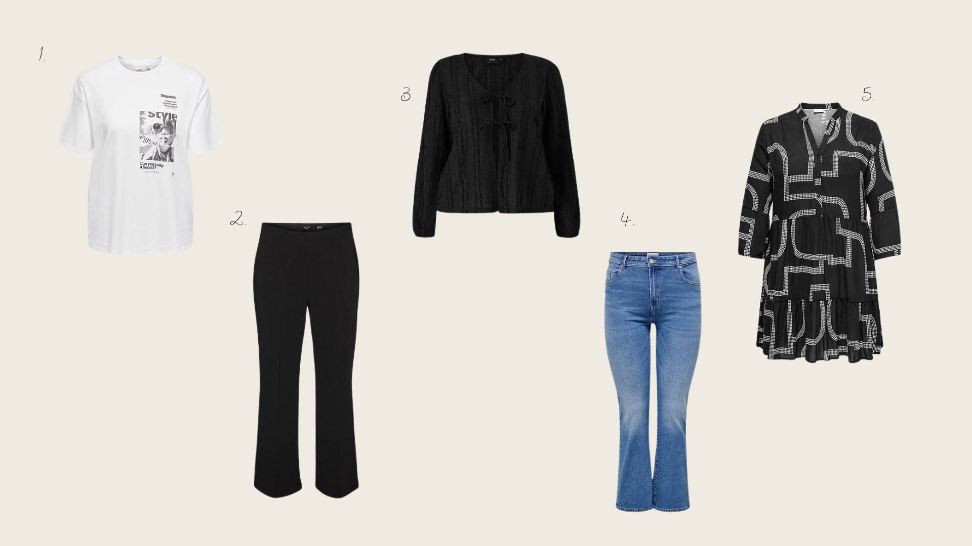 1. Pernille t-paita* / 2. Becky housut* / 3. Zizzi neuletakki* / 4. Sally farkut* /5. Matte mekko*