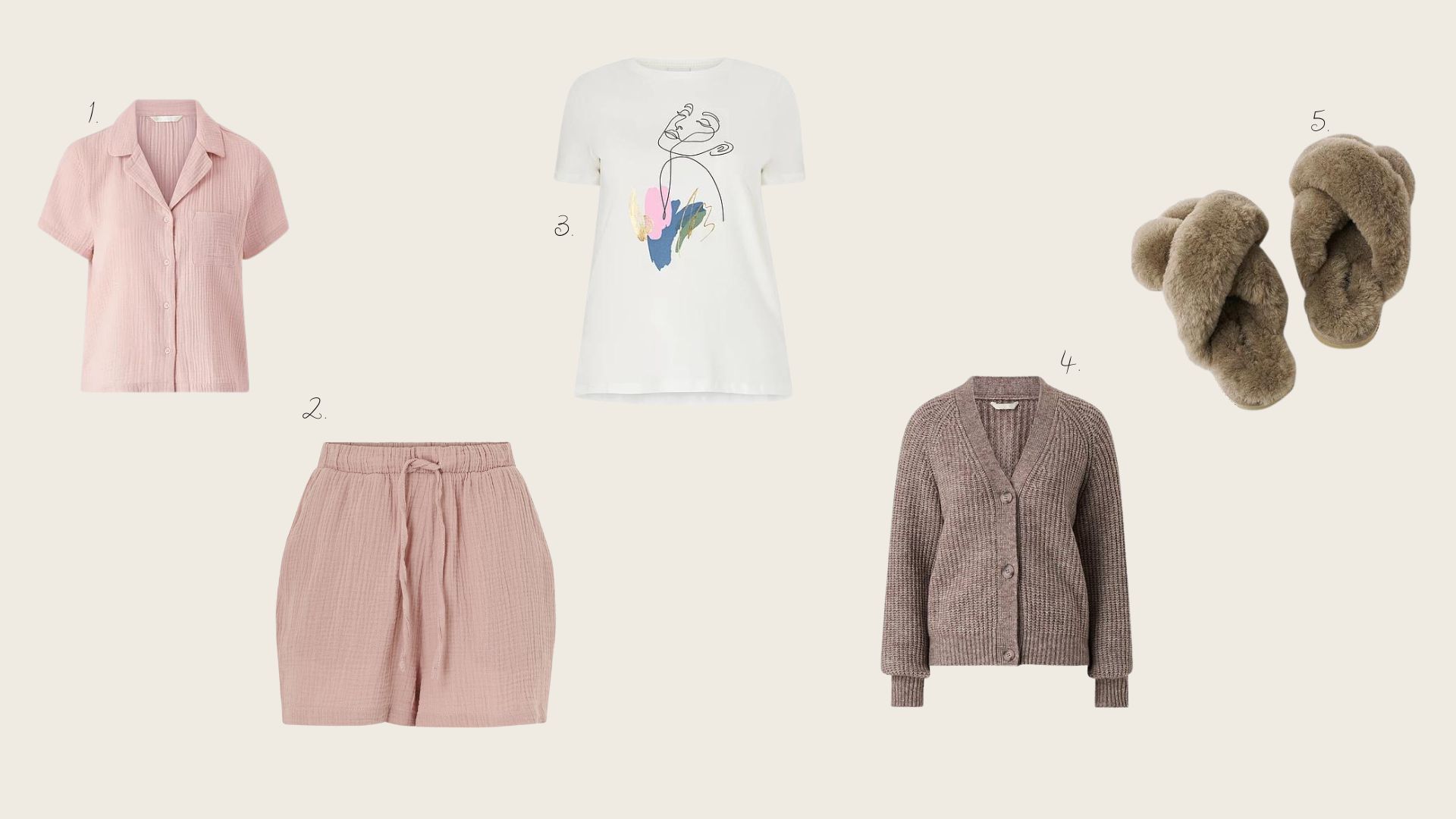 1. Pyjamapaita* / 2. Pyjamahousut* / 3. Diala toppi* /4. Kylkikangastakki* / 5. Áhkká tossut*