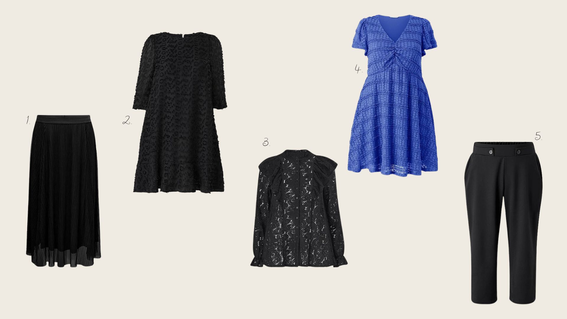 1. Lavine hame* / 2. Olivia mekko* / 3. Zizzi paita* / 4. Positano mekko* / 5. Caprihousut*