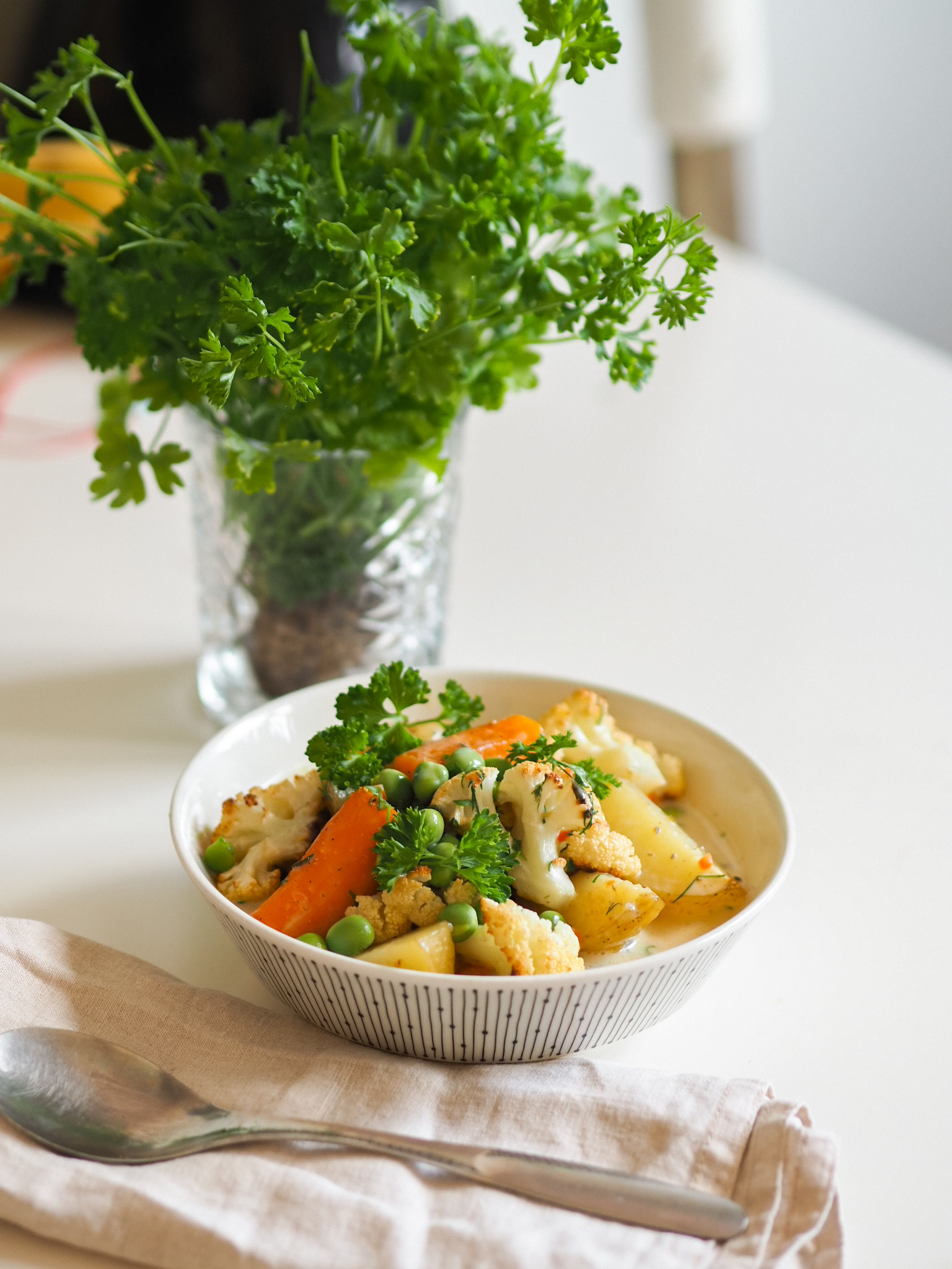 Sitten törmäsin tänä kesänä Vienna K:n Instagramissa. Kyseisessä keitossa kasvikset paahdetaan uunissa ja liemi tehdään erikseen. Sitten keitto kootaan lautaselle. Minä rakastan uunissa paahdettuja kasviksia. Kun nähtiin Toten kanssa tämä resepti, todettiin kumpikin, että halutaan ehdottomasti kokeilla. Vaikka minulla itselläni oli ongelmia kesäkeiton kanssa ja Totte ei ole ollut mikään kukkakaalin ystävä. Keitto vakuutti meidät molemmat.