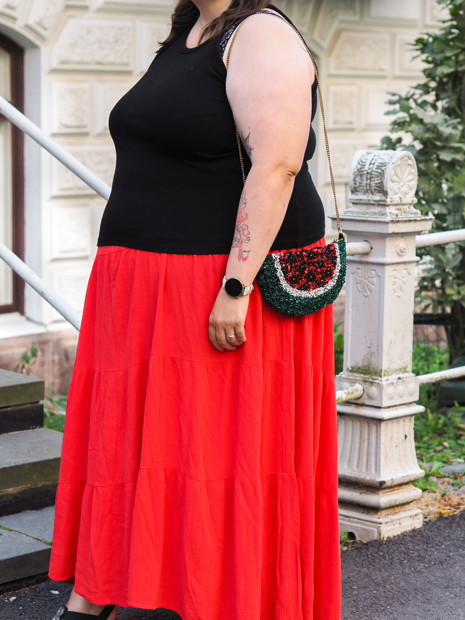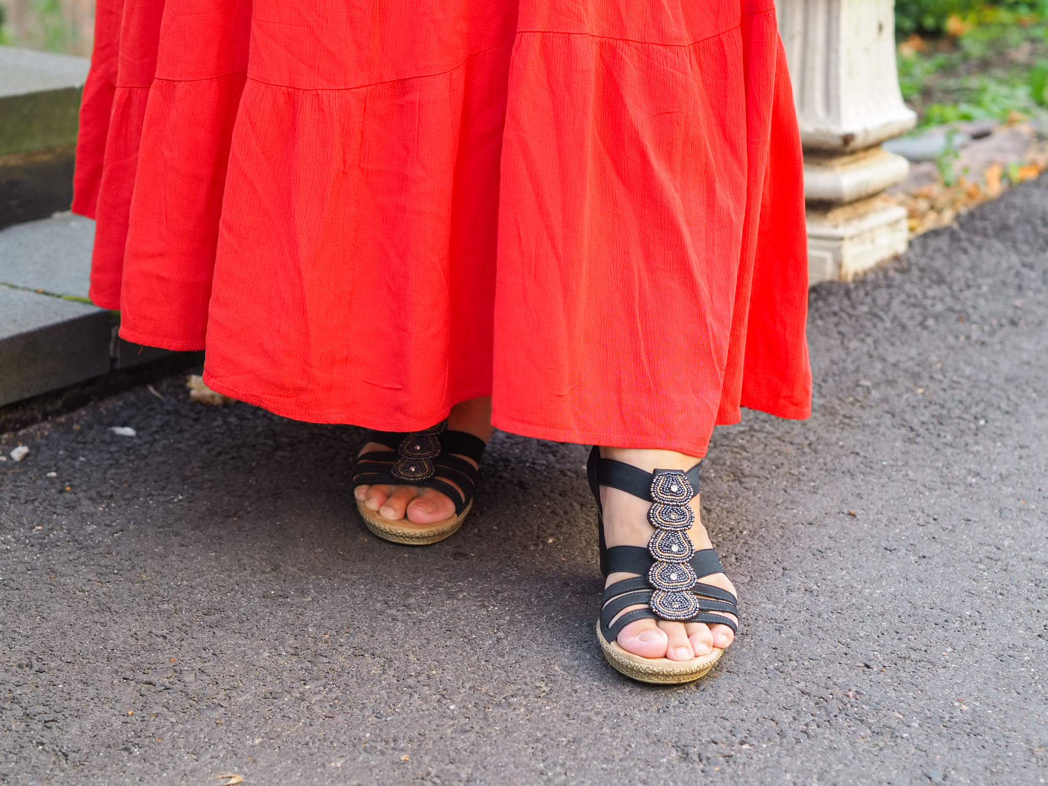 Minulla ei ole ollut aiemmin näin pitkää maxihametta. Yleensä nilkat ovat näkyneet helman alta. Tämän kanssa, sieltä vilkkuvat korkeintaan varpaat. Ilman kenkiä tämä meinaa kyllä laahata maata. Toki hameen vyötäröä voi nostaa ylemmäs vartalolla. Minulle, 167 senttiselle ihmiselle, pituus on kuitenkin aika kiva.