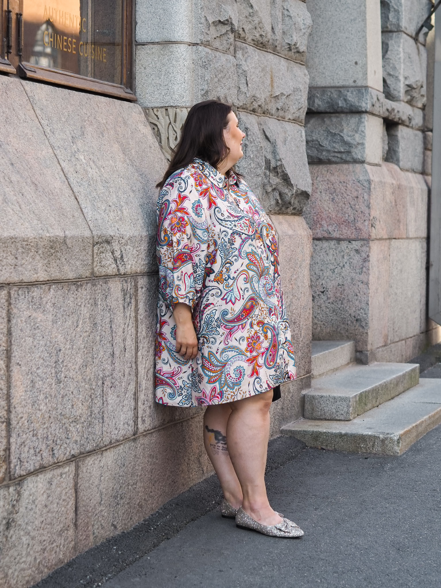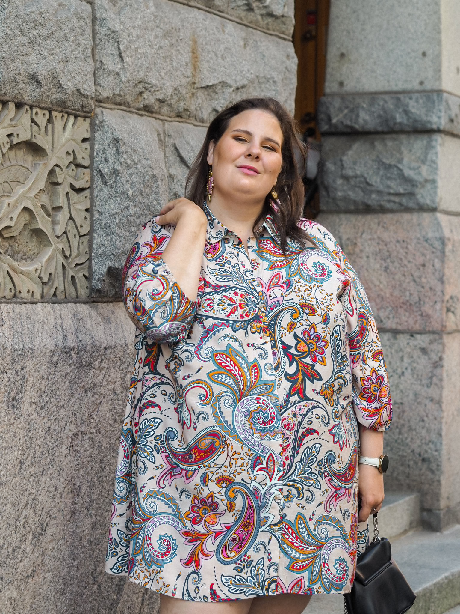 Kuosi on minun mittapuullani todella värikäs, jonka vuoksi arvoin tätä pitkään. Tulisiko minun oikeasti käytettyä tätä vaatetta? Pohdinnan jälkeen, päätin kuitenkin, että tämä on minua varten. Paitamekon malli on ihana ja rento. Samaan aikaan kuosi tekee siitä jotenkin juhlavan. Tämä on aivan ihana, näyttävä vaatekappale.