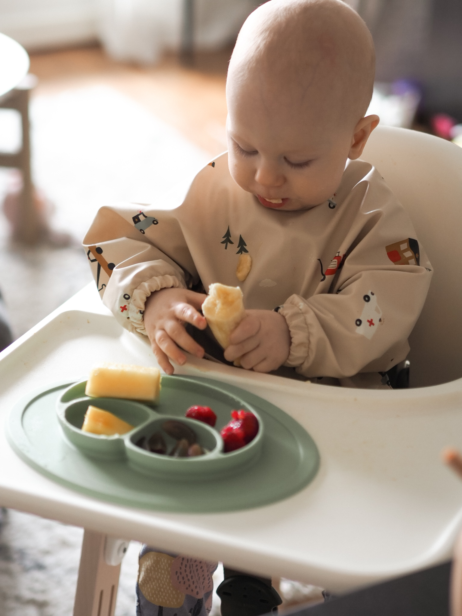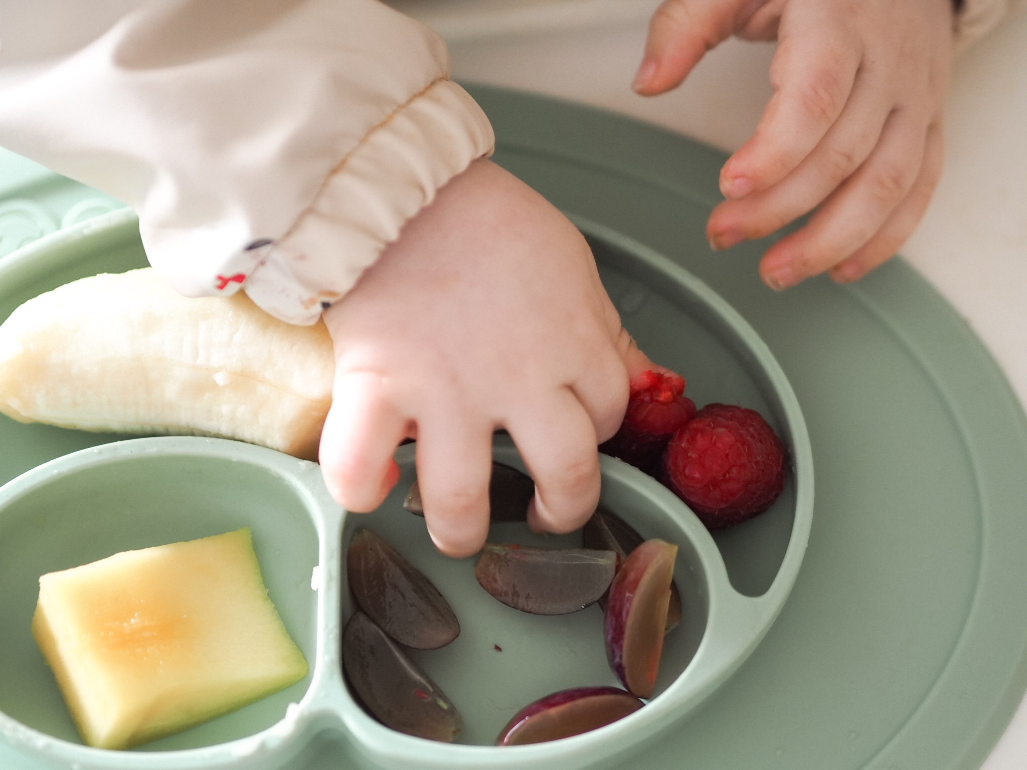 Tämä on ehkä itsestään selvä, mutta meillä äärimmäisen toimiva. Taapero on alusta asti maistellut hedelmiä ja marjoja tosi rohkeasti. Kun ollaan tehty meille parempaa aamupalaa tai brunssi, niin lapsi on viihtynyt pitkään omien hedelmiensä parissa.