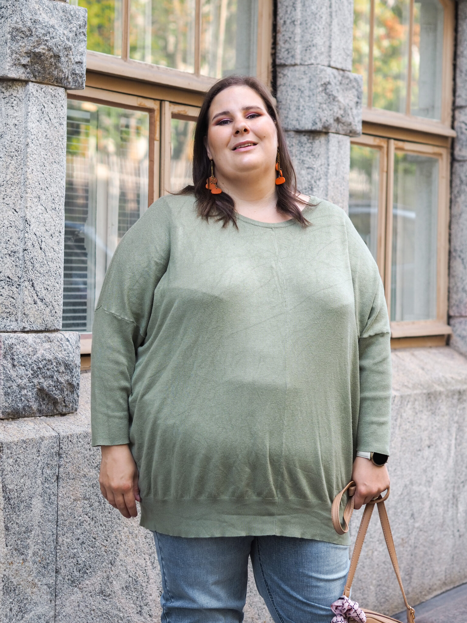 Tarkoitukseni on esitellä teille tämä kaunis, vihreä tunika. Tässä malli ei ole se kaikkein perinteisin. Eikä tämä ole musta tai armyvihreä. Elloksen* sivujen mukaan puseron väri on oil green. Nyt täytyy sanoa, että en ihan ymmärrä nimeä, mutta se on joka tapauksessa kaunis väri. Luonnossa se on murrettu, vaaleanvihreä.