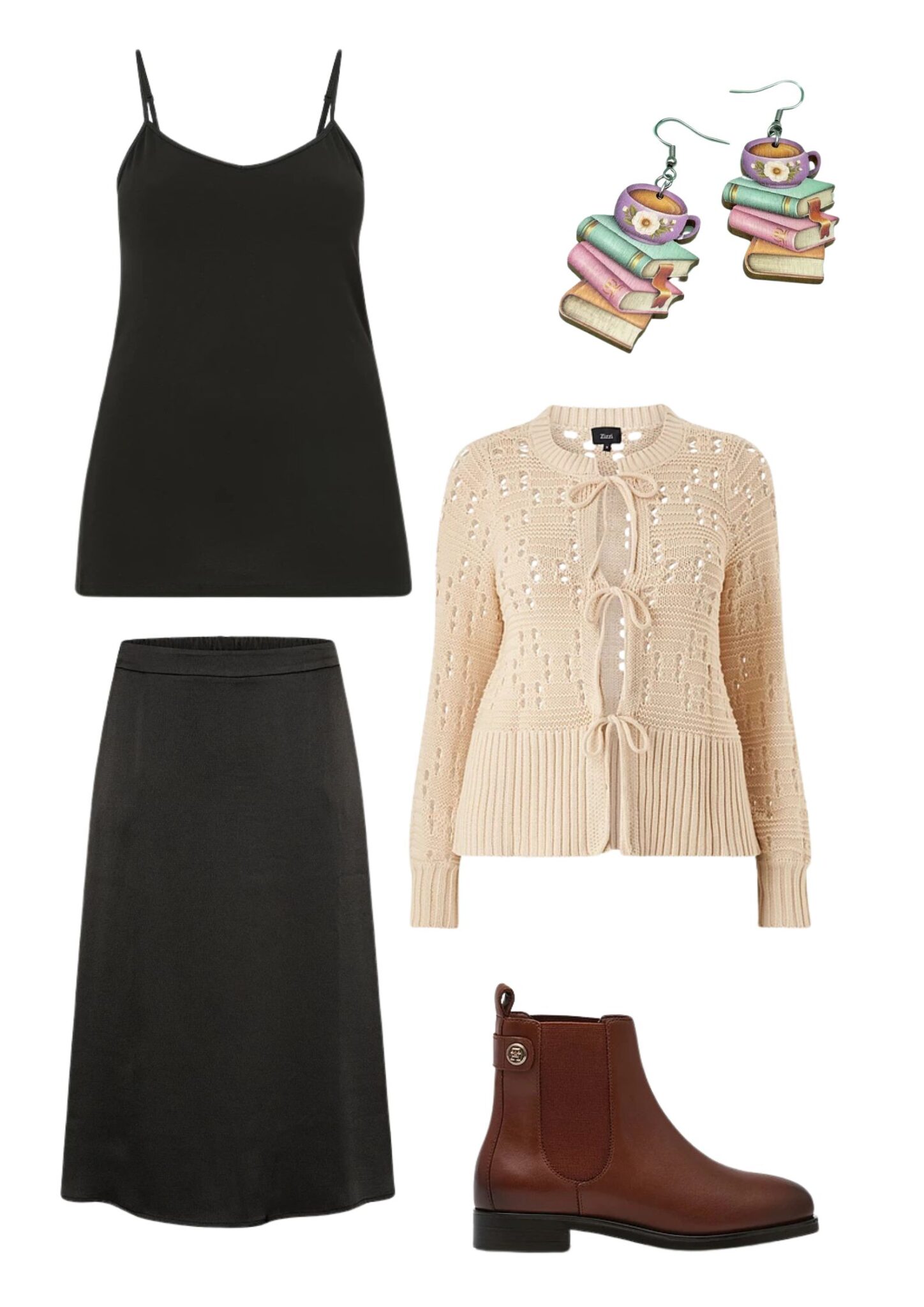 Minun mieleeni tässä asussa on sellaiset moderni runotyttö vibat. Neuletakki tekee asusta romanttisen oloisen. Kirja kainaloon ja teekuppi käteen. Siksi tämän pariksi sopisikin erityisen hyvin juuri nuo Design by Kieto korvikset. Tyyliä voisi täydentää vielä pastellisella pannalla.