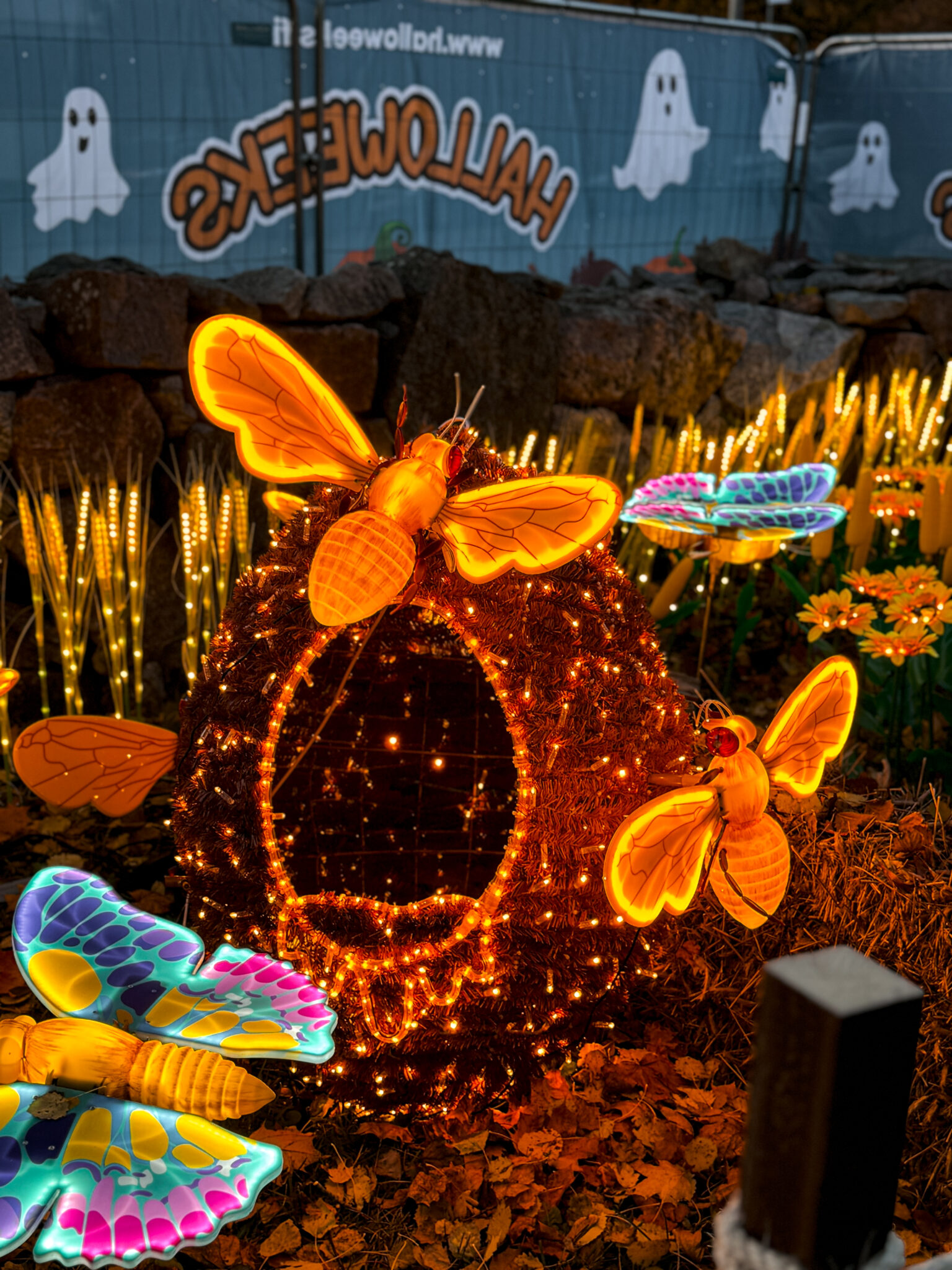 Kahvilahetken jälkeen ilta alkoi hiljalleen hämärtyä ja päästiin ihailemaan puiston valoja. Tässä vaiheessa puisto täyttyi myös muista vierailijoista. Suurin osa oli selkeästi ajoittanut vierailunsa nimenomaan pimeälle ajalle. Minkä ymmärrän. Onhan halloweenpuisto selkeästi vaikuttavampi pimeällä. Tässä vaiheessa meidän isot alkoivat leikkimään piilosta. 😅