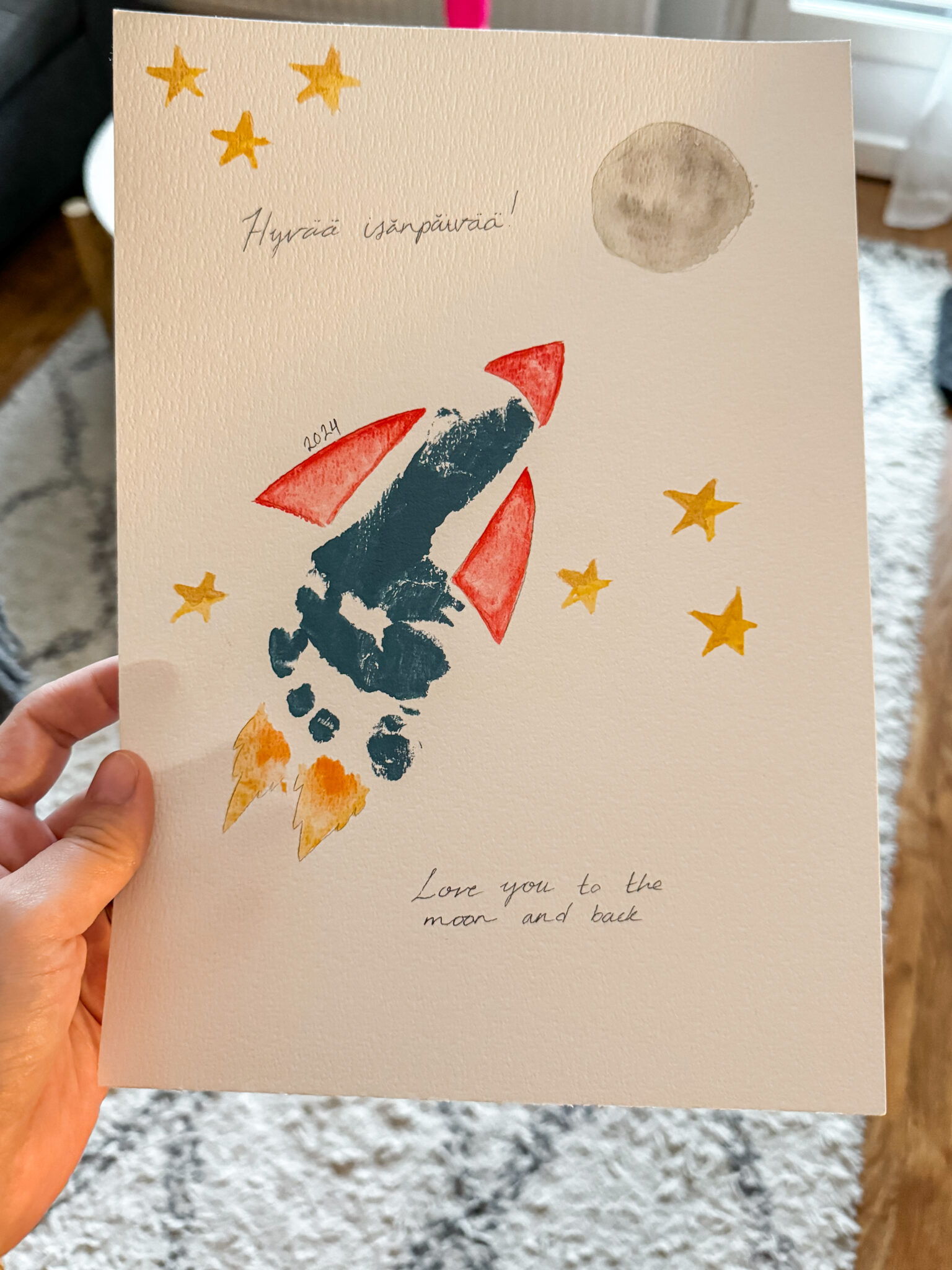 Taapero ei päässyt vielä kummemmin askartelemaan. Ehkä ensivuonna. Minä toimin hänen kortissaan vielä tänäkin vuonna luovana johtajana. Painettiin vielä kertaalleen hänen jalanjälkensä meille muistoksi. Sain idean korttiin Pinterestistä. Mielestäni siitä tuli todella onnistunut.