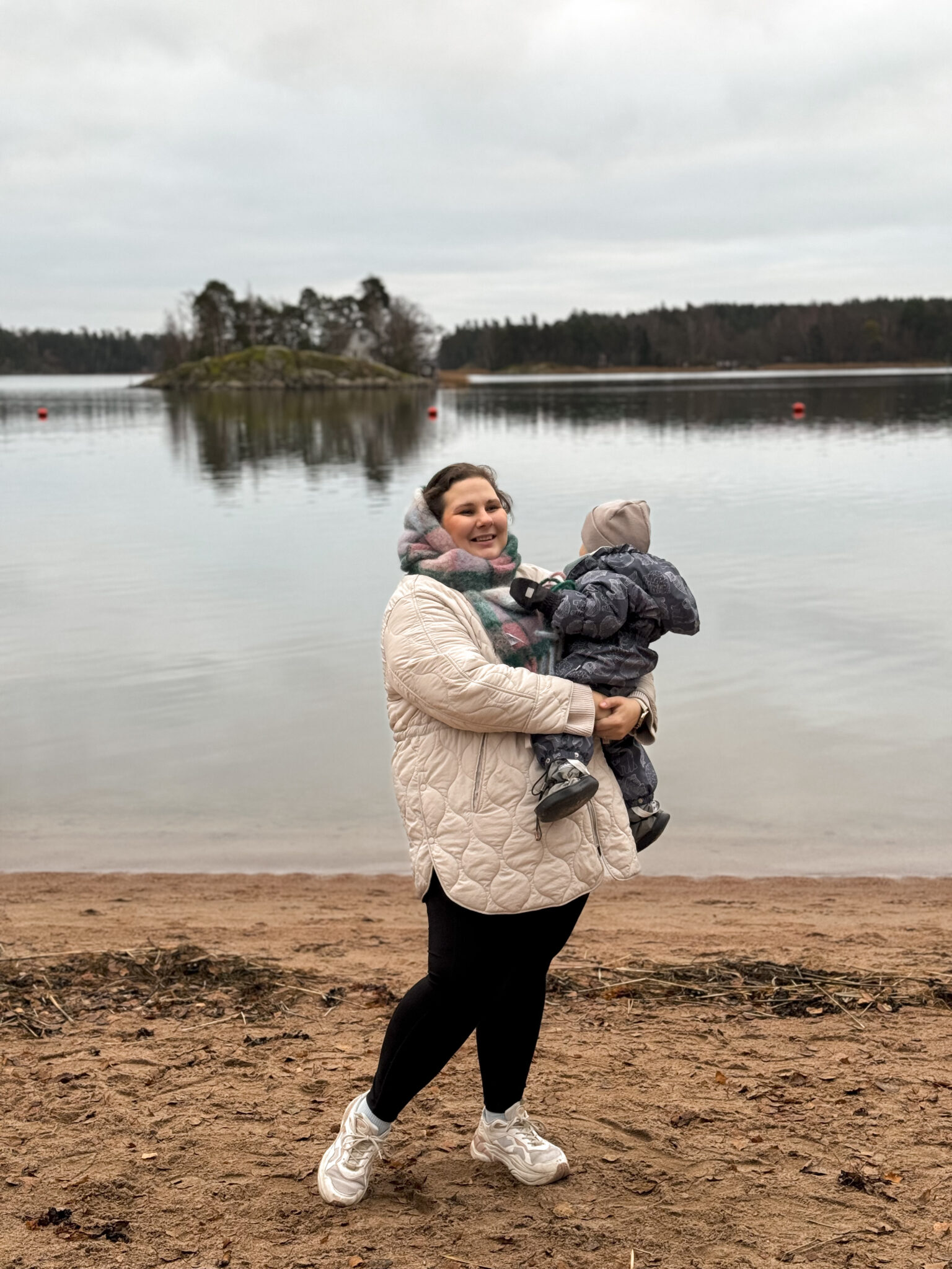Sää oli ulkoilulle ihan super hyvä, vaikkakin harmaa. Käveltiin meidän uimarannalle. Mietittiin ampaiseeko taapero suorinta tietä mereen, mutta hän pysytteli koko ajan kunnioitettavan välimatkan päässä vedestä. Muuten hän kyllä katseli rannalla ympärilleen.
