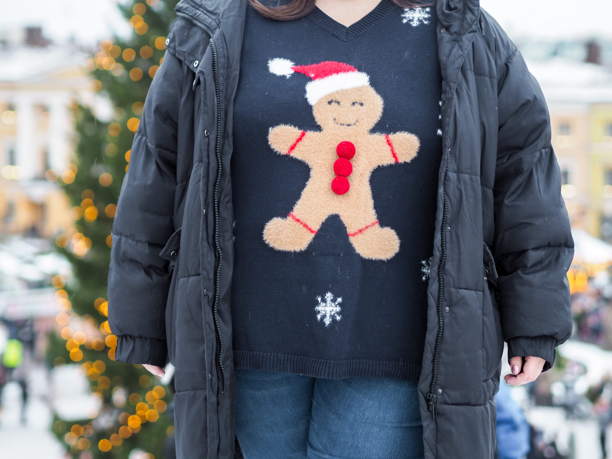 Minulla ei ole ollut aiemmin jouluneuletta. Tämä kyseinen neule on aivan ihana. Se on minun makuuni riittävän simppeli, mutta samaan aikaan jouluinen. Lapset rakastavat tätä, koska nuo pipariukon napit ovat pompomeja. Ja onhan tämä kaikin puolin super söpö. Jouluneule on kyllä sellainen vaate, että en hankkisi niitä kaappiin kuin yhden kivan. Käyttöaika on kuitenkin tosi lyhyt.