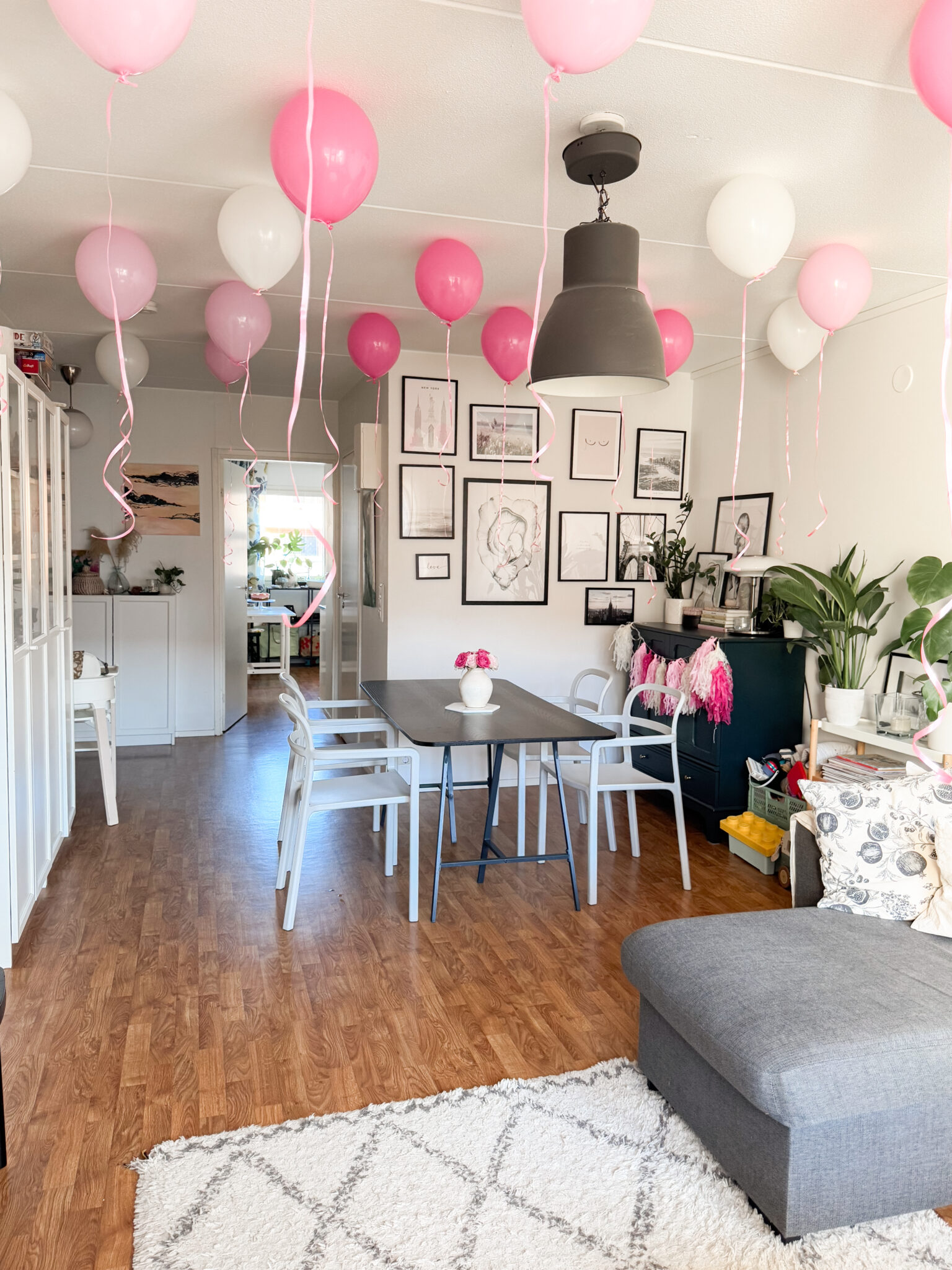Ollaan aina koristeltu melko simppelisti. Ilmapallot tekevät jo paljon. Kun ne kiinnittää kattoon kuvissa näkyvällä tavalla, muuta ei oikeastaan tarvita. Pallot tulivat kattoon kiinni kaksipuoleisella tarralla. Niiden lisäksi kaivettiin esille kaapista hapsukoristetta* ja Happy birthday-kylttiä*. Näillä saatiin jo oikein kivat koristelut aikaiseksi.