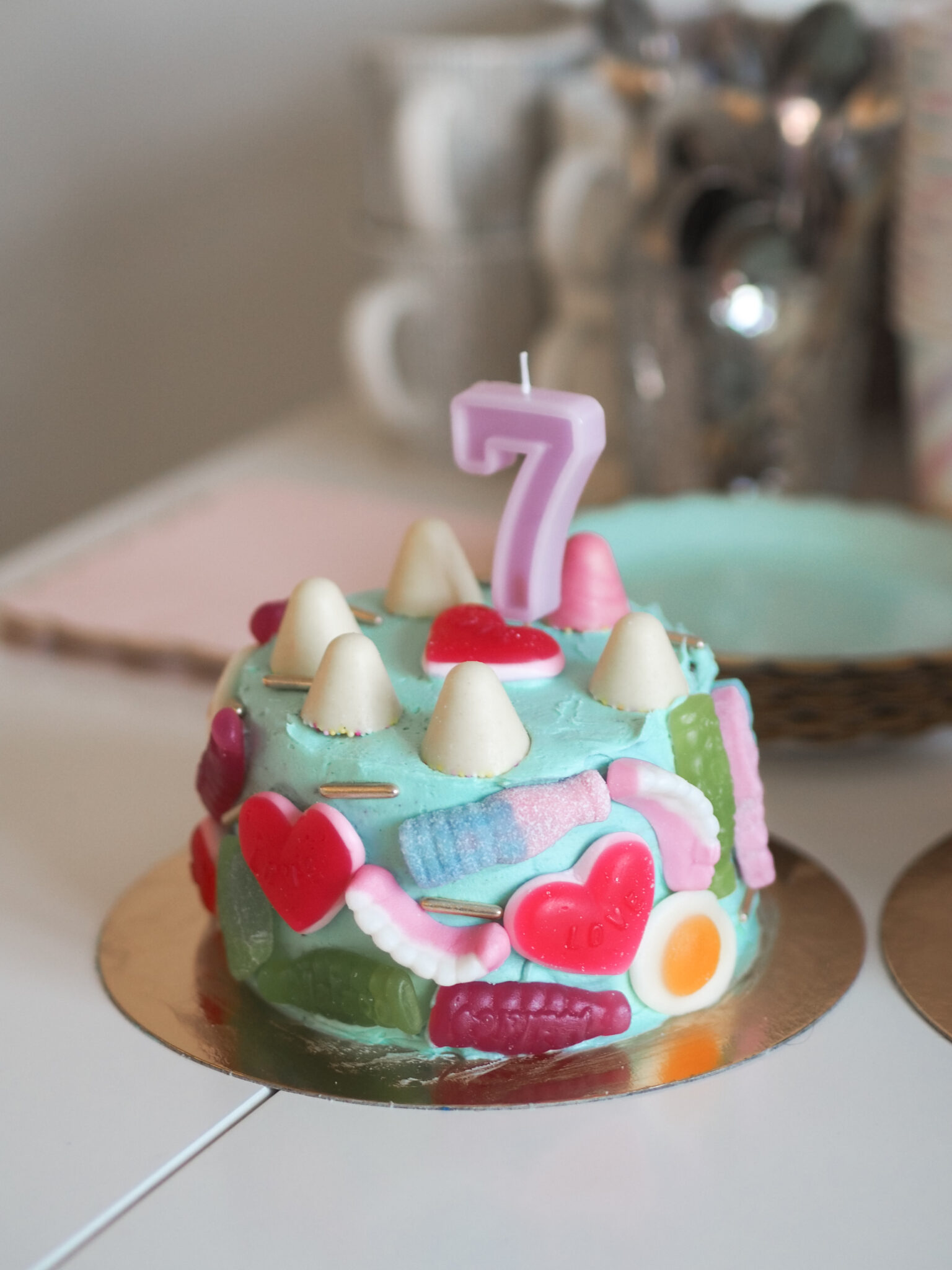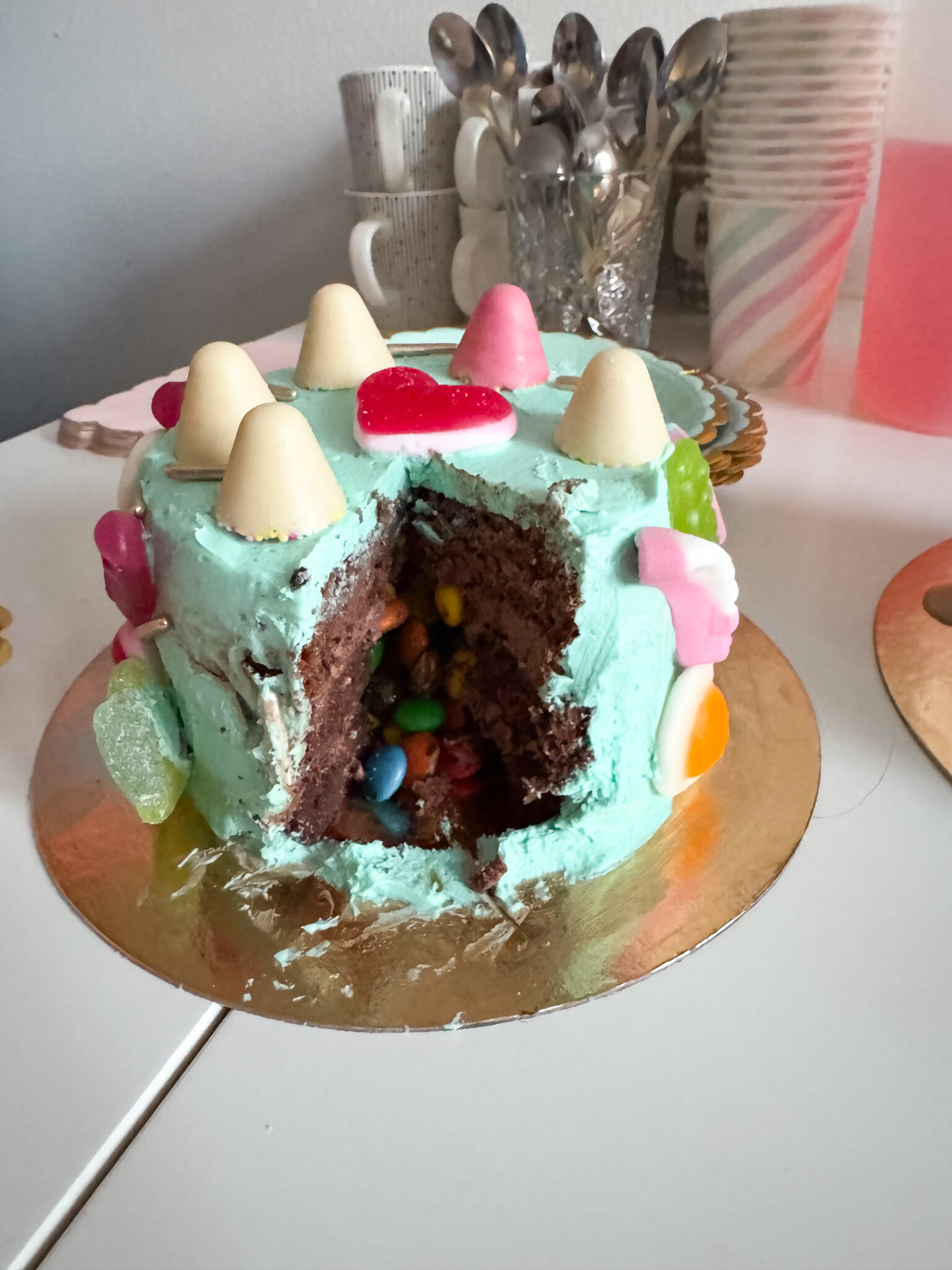 Pinjata-kakku tuotti ehkä eniten päänvaivaa, mutta lopulta onnistuin melko hyvin siihen nähden, että en ollut koskaan leiponut vastaavaa. Kakku näytti kakulta, pysyi koossa ja sen sisällä oli juuri niitä karkkeja, joita lapsi toivoi. Huomaan kehittyväni koko ajan kakkujen koristelussa, mutta parannettavaa on vielä. Nyt mitoitin kutakuinkin oikein voikreemin määrän, jota pidän onnistumisena!