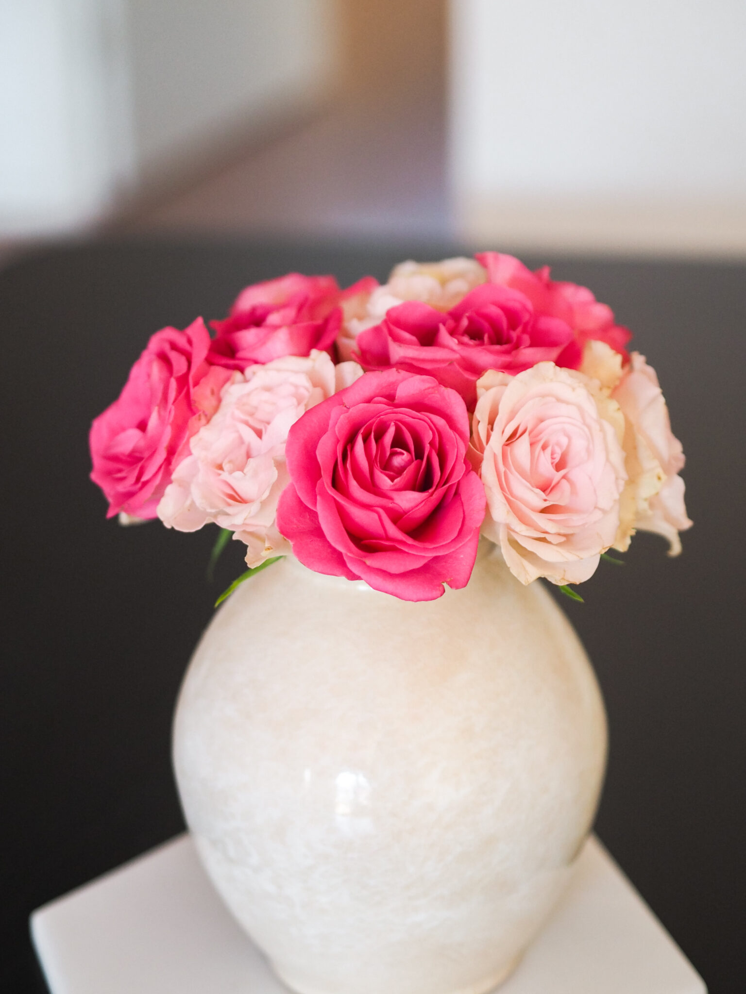 Olemassa olevien koristeiden ja ilmapallojen lisäksi ostettiin ihan marketista pari kimppua erisävyisiä ruusuja ja tein näistä yksinkertaiset asetelmat kahteen maljakkoon. Toinen tuli olohuoneen ruokapöydälle ja toinen keittiöön, jossa tarjottavat olivat esillä. Minulle kukat ovat olleet aina tapa tuoda kotiin juhlan tuntua. Nämä kaksi ruusukimppua olivat juuri täydellinen lisä syntymäpäivien koristeluihin.