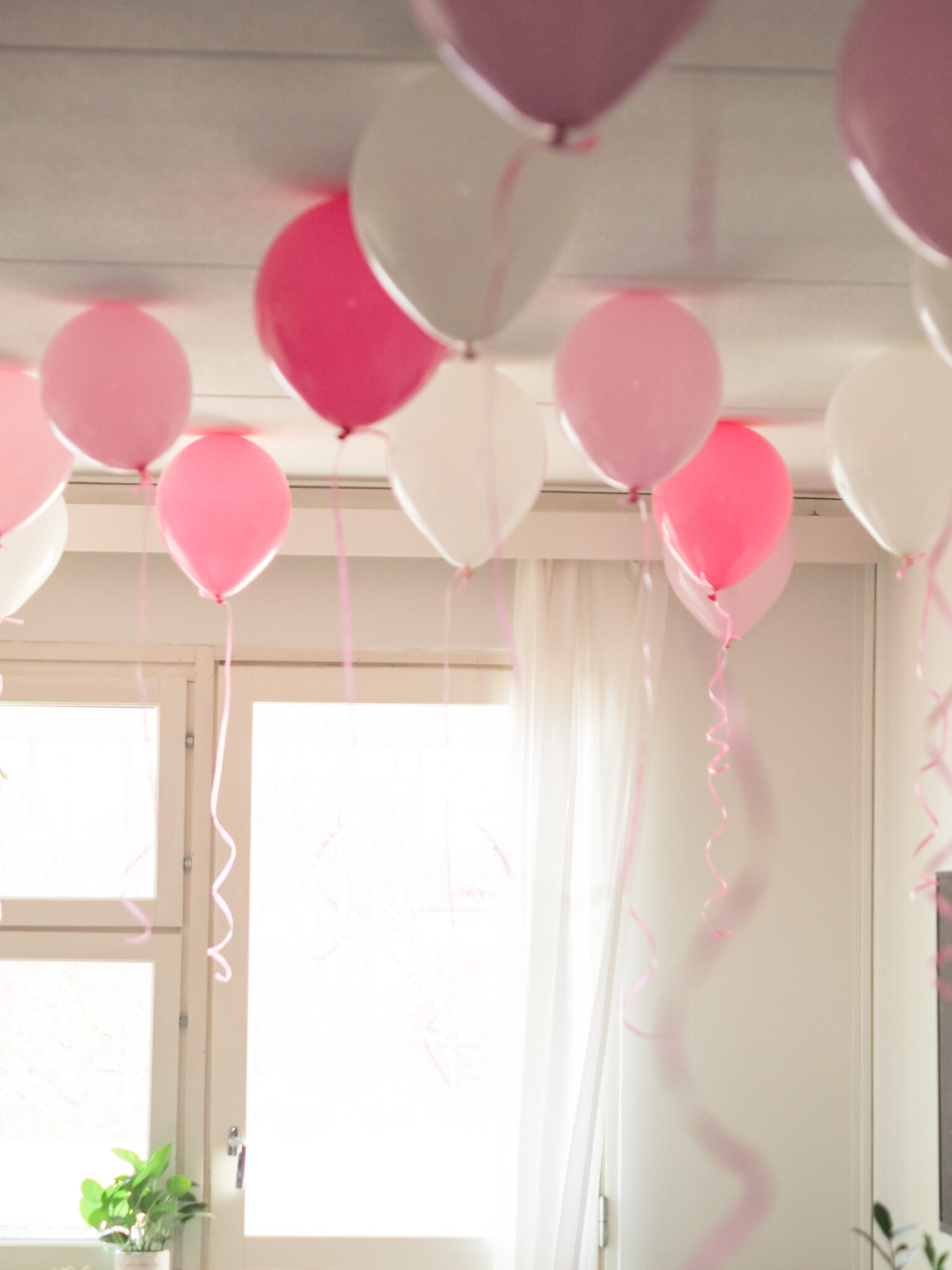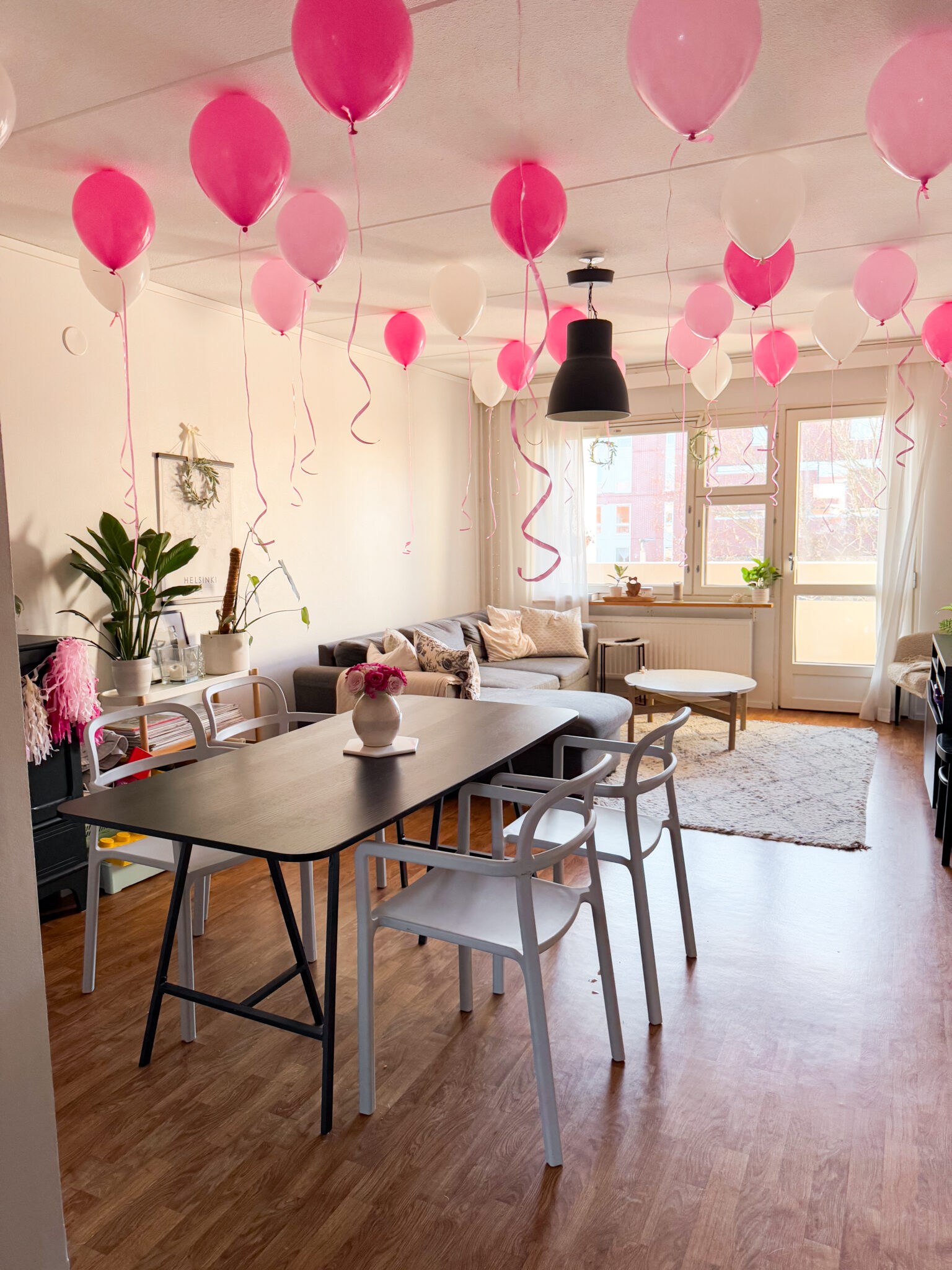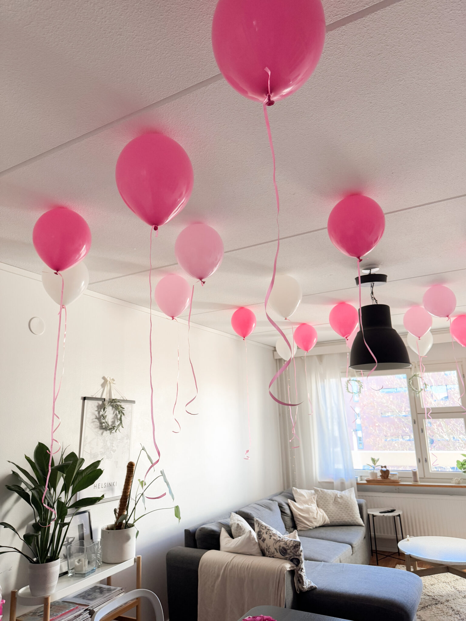 Ollaan aina koristeltu melko simppelisti. Ilmapallot tekevät jo paljon. Kun ne kiinnittää kattoon kuvissa näkyvällä tavalla, muuta ei oikeastaan tarvita. Pallot tulivat kattoon kiinni kaksipuoleisella tarralla. Niiden lisäksi kaivettiin esille kaapista hapsukoristetta* ja Happy birthday-kylttiä*. Näillä saatiin jo oikein kivat koristelut aikaiseksi.