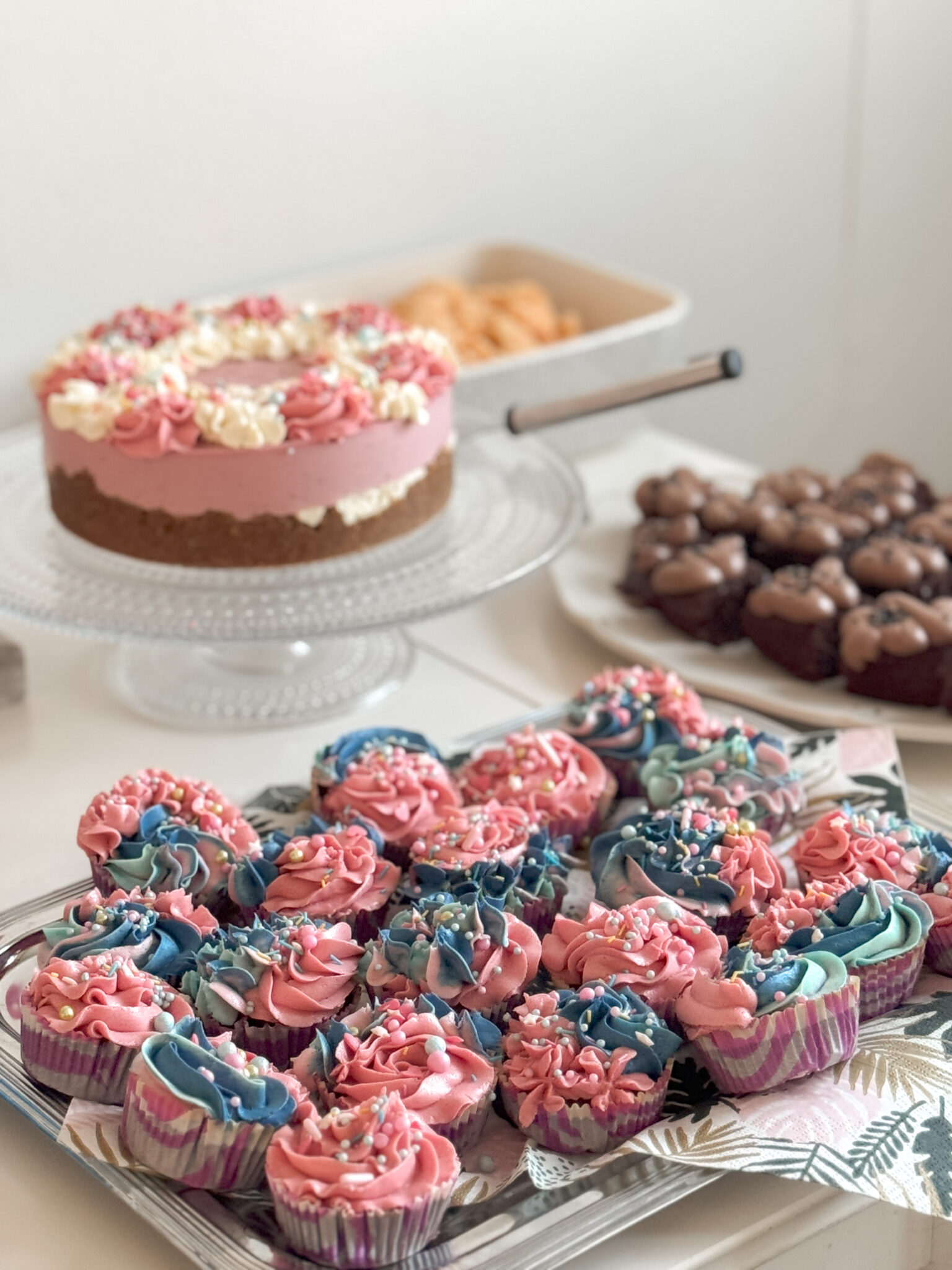 Pienten kakkujen lisäksi päätin leipoa muffinsseja ja juustokakun. Lopulta juhlapäivänä, leivoin myös yhden vuoallisen brownieita. Yhteen kakkuun käytettyä suklaamoussea jäi niin paljon yli, että pystyin hyödyntämään sitä niiden koristelussa. Lisäksi kaapissa oli muutenkin valmiina ainekset brownieihin.