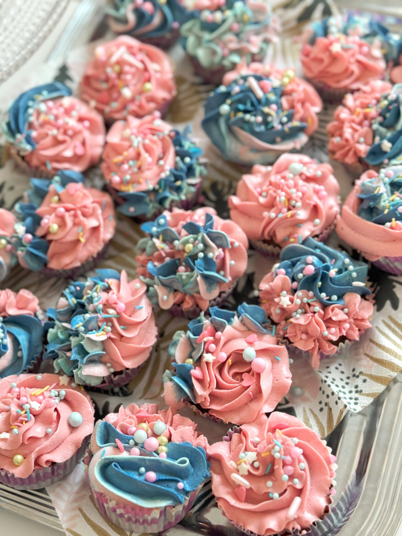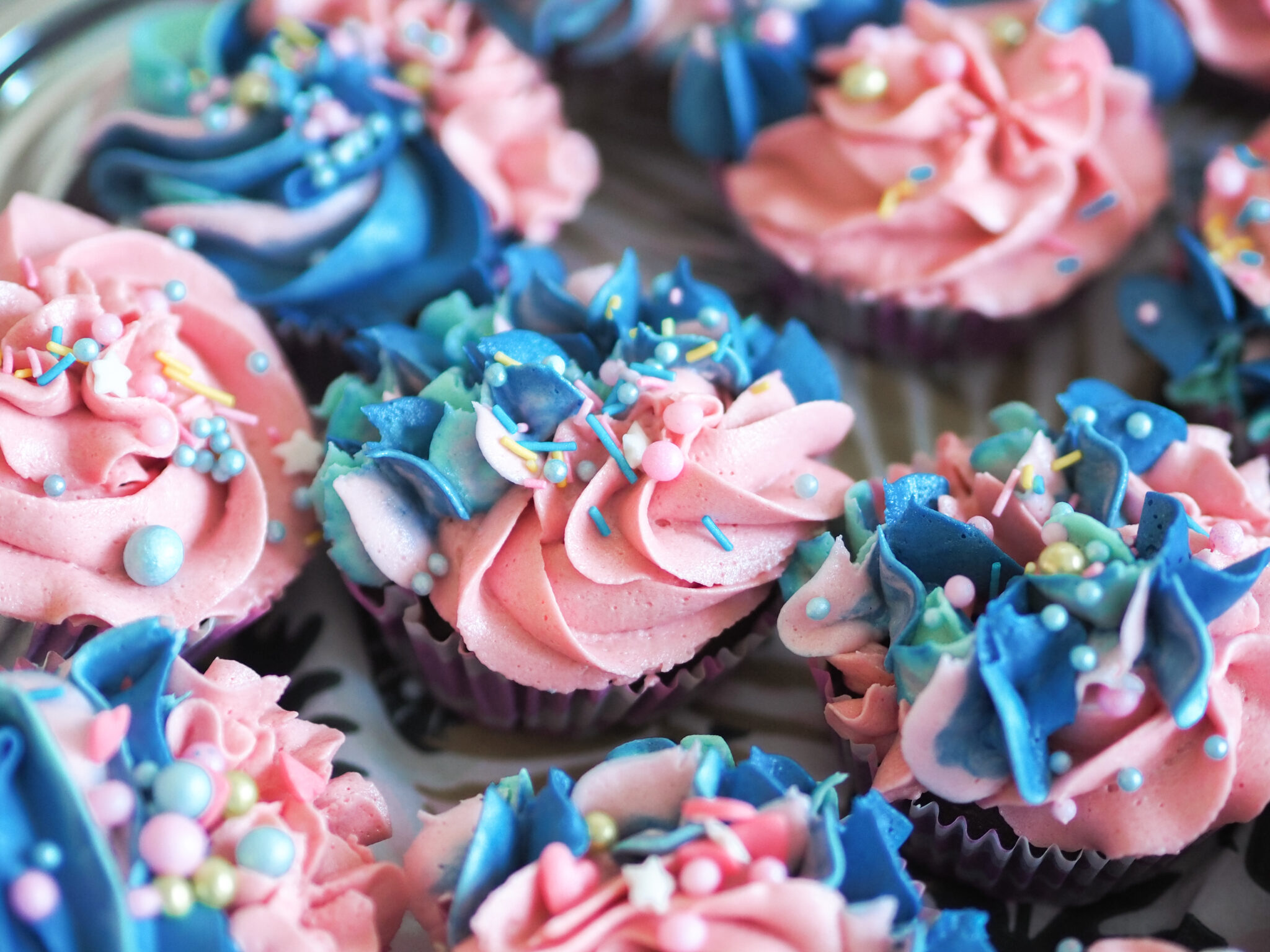 Muffinsseihin käytin tätä reseptiä. Kinuskikreemin lisäksi hyödynsin lopun kakkujen päälle tulleesta voikreemistä. Sain tällä tavalla aikaan tosi kivat, värikkäät koristelut. Koristerakeet olin ostanut niin ikään My Dream Daysta*, jossa on monenlaisia söpöjä koristesekoituksia.