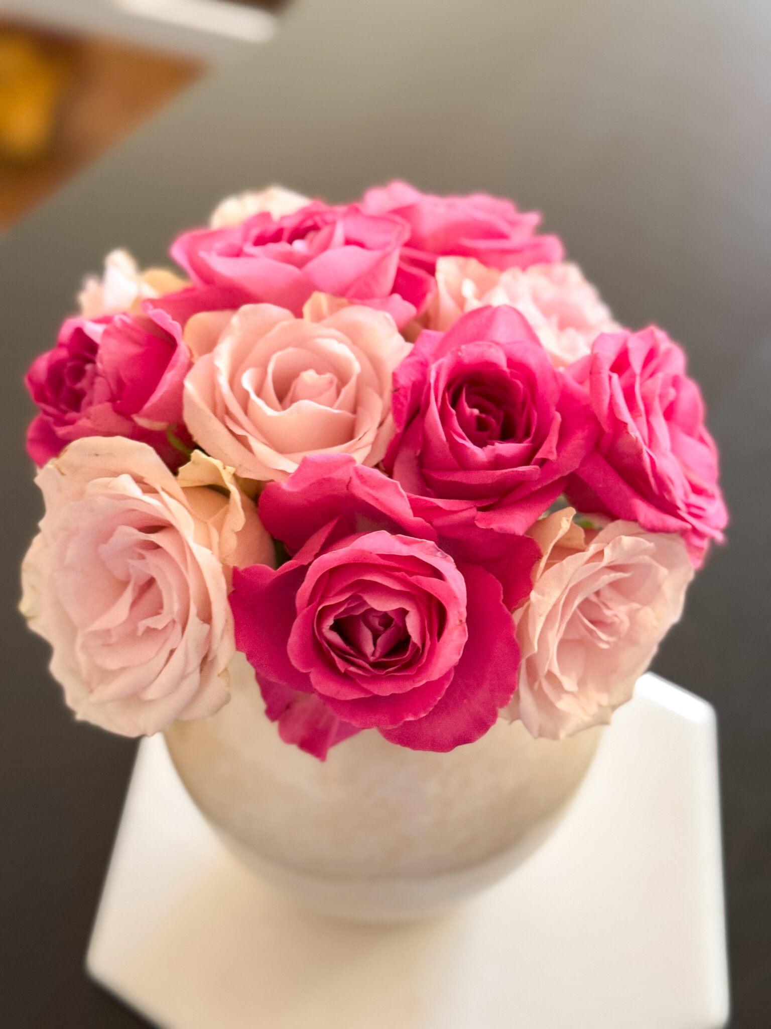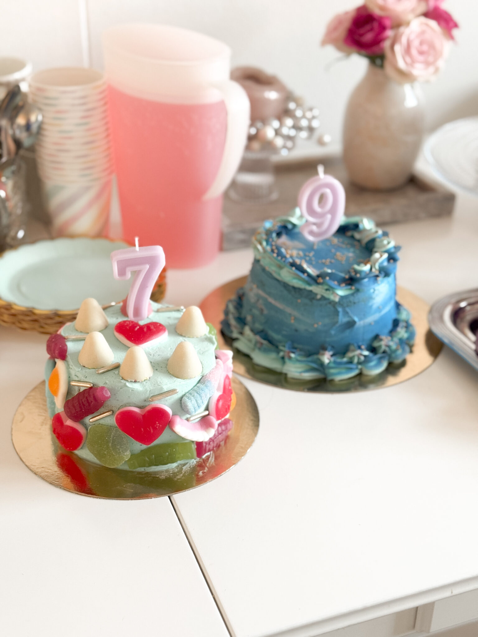 Olemassa olevien koristeiden ja ilmapallojen lisäksi ostettiin ihan marketista pari kimppua erisävyisiä ruusuja ja tein näistä yksinkertaiset asetelmat kahteen maljakkoon. Toinen tuli olohuoneen ruokapöydälle ja toinen keittiöön, jossa tarjottavat olivat esillä. Minulle kukat ovat olleet aina tapa tuoda kotiin juhlan tuntua. Nämä kaksi ruusukimppua olivat juuri täydellinen lisä syntymäpäivien koristeluihin.