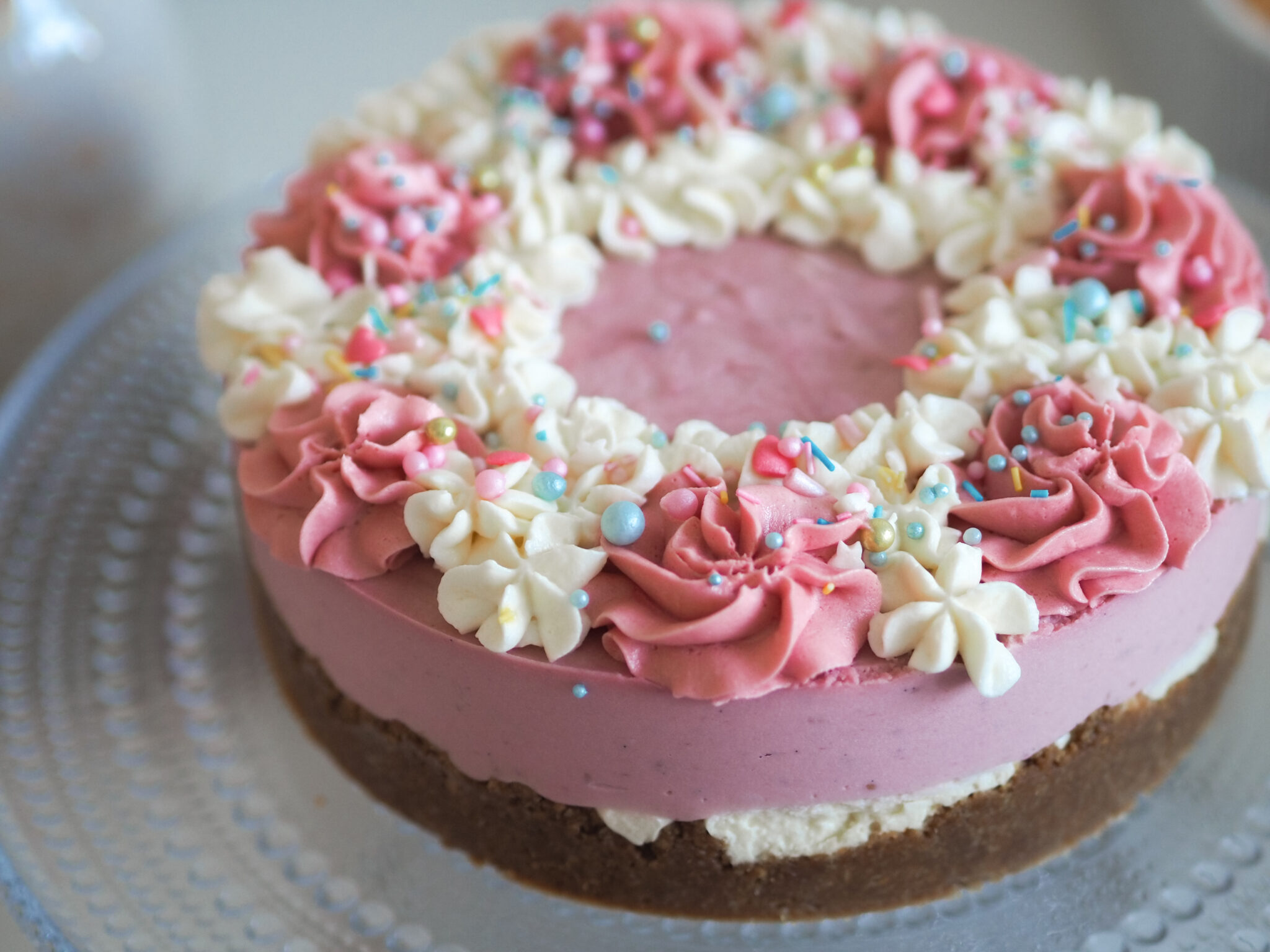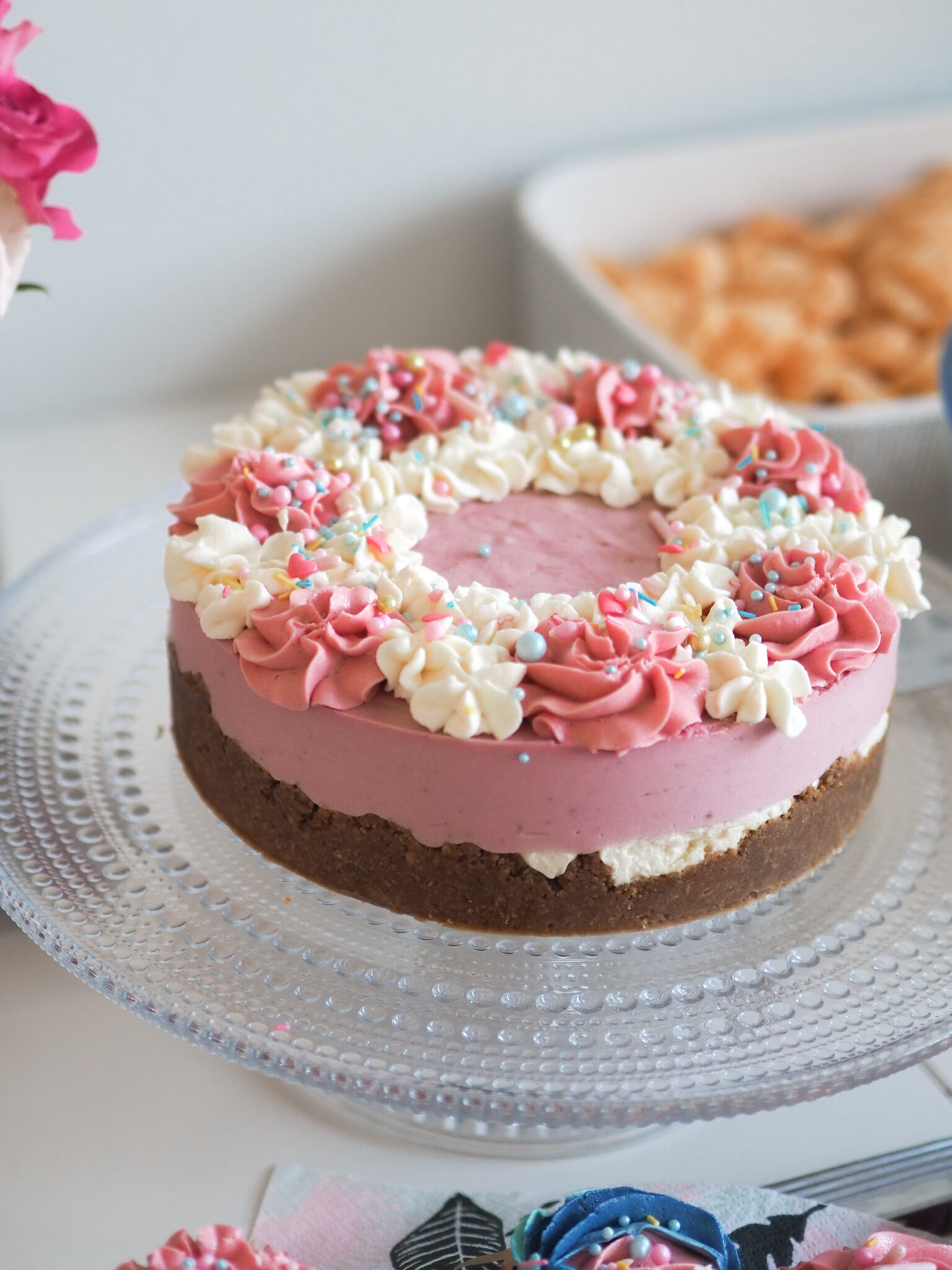 Juustokakun makuparina oli vadelma ja valkosuklaa. Hyödynsin kakkuun tätä mustikka-valkosuklaa juustokakku reseptiä, mutta vaihdoin mustikkasoseen tilalle vadelmasoseen. Ja tämä toimi ihan super hyvin. Kakusta tuli myös tosi kauniin näköinen. Vuorasin kakkuvuoan leivinpaperilla ja reunakalvolla*. Näiden avulla reunasta saa tosi siistin ja viimeistellyn näköisen.