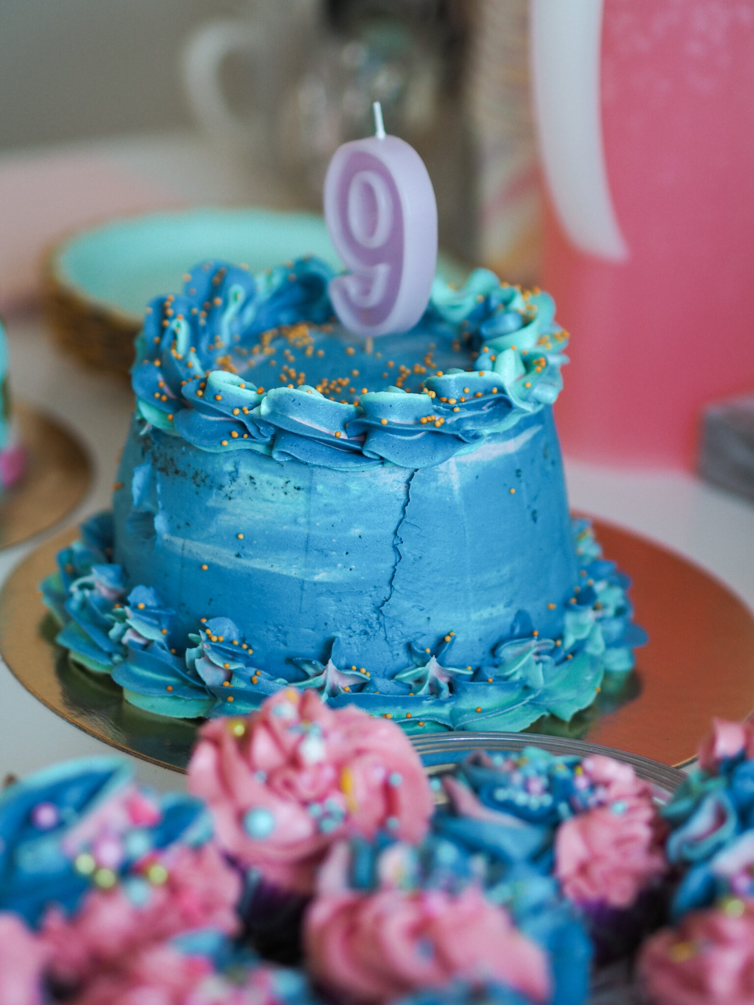 Pinjata-kakku tuotti ehkä eniten päänvaivaa, mutta lopulta onnistuin melko hyvin siihen nähden, että en ollut koskaan leiponut vastaavaa. Kakku näytti kakulta, pysyi koossa ja sen sisällä oli juuri niitä karkkeja, joita lapsi toivoi. Huomaan kehittyväni koko ajan kakkujen koristelussa, mutta parannettavaa on vielä. Nyt mitoitin kutakuinkin oikein voikreemin määrän, jota pidän onnistumisena!