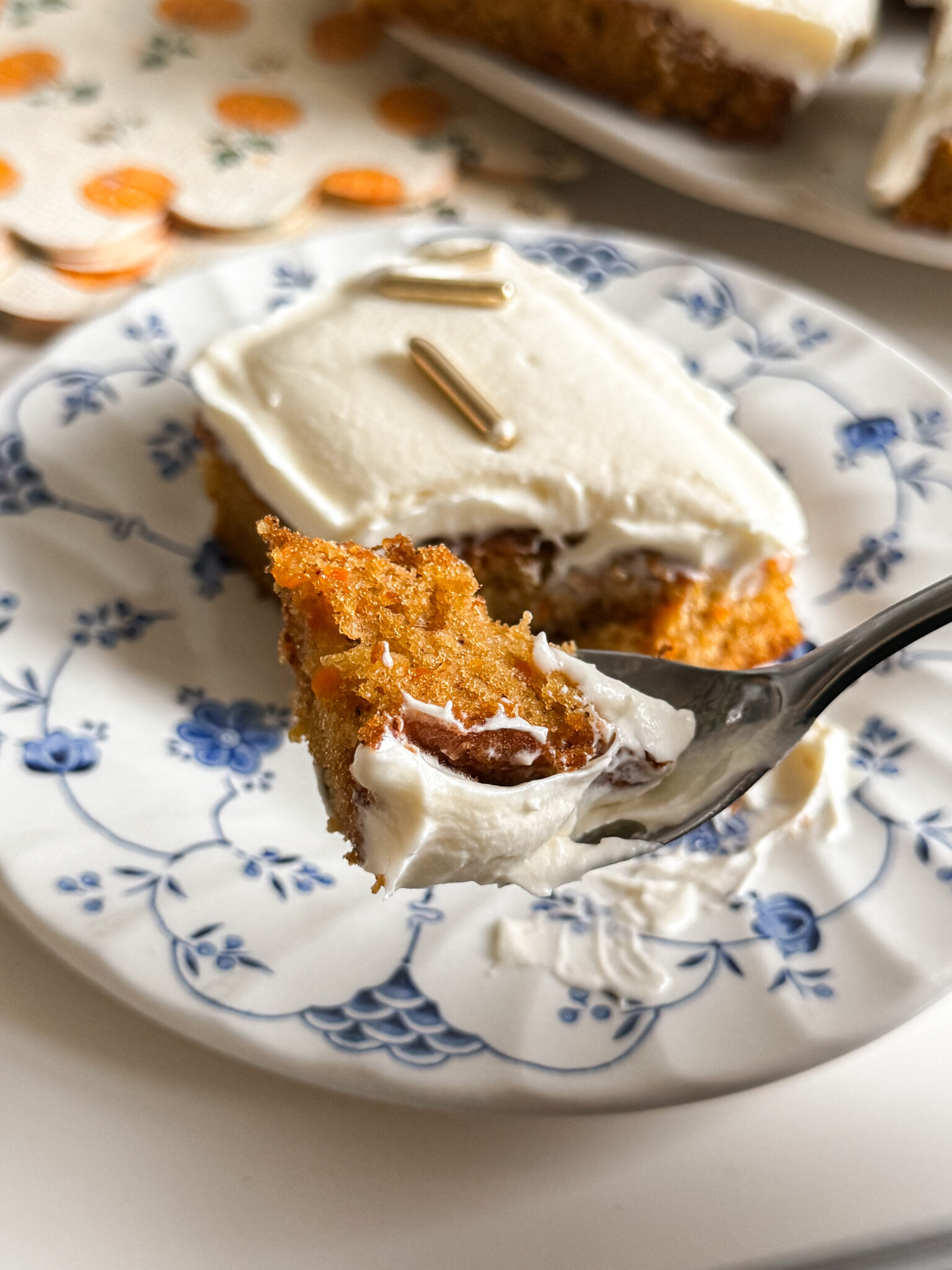 Porkkanapiirakka. Minulle se tuo heti mieleen lapsuuden. Meidän Sipoon kodin pienen keittiön, jossa korkeista ikkunoista paistoi aurinko sisään. Ikkunoita reunusti meidän äidin siniset lehmäverhot. (Kyllä, luit oikein.) Porkkanapiirakka oli mehevää, pehmeää ja kuorrute suorastaan suli suuhun. Minulle tämä muisto on äärimmäisen selvä ja palaan tähän aina, kun mietin porkkanapiirakkaa.