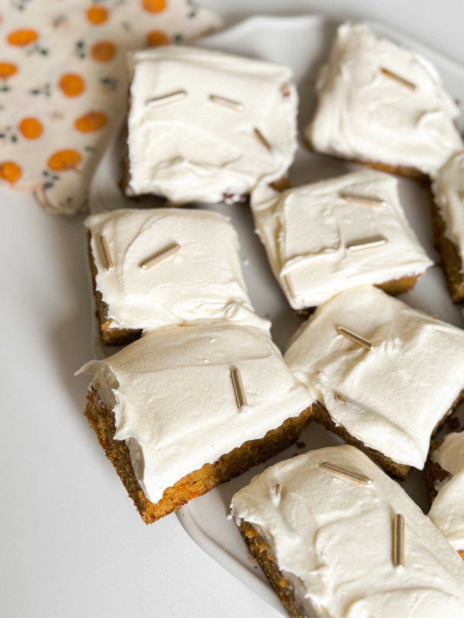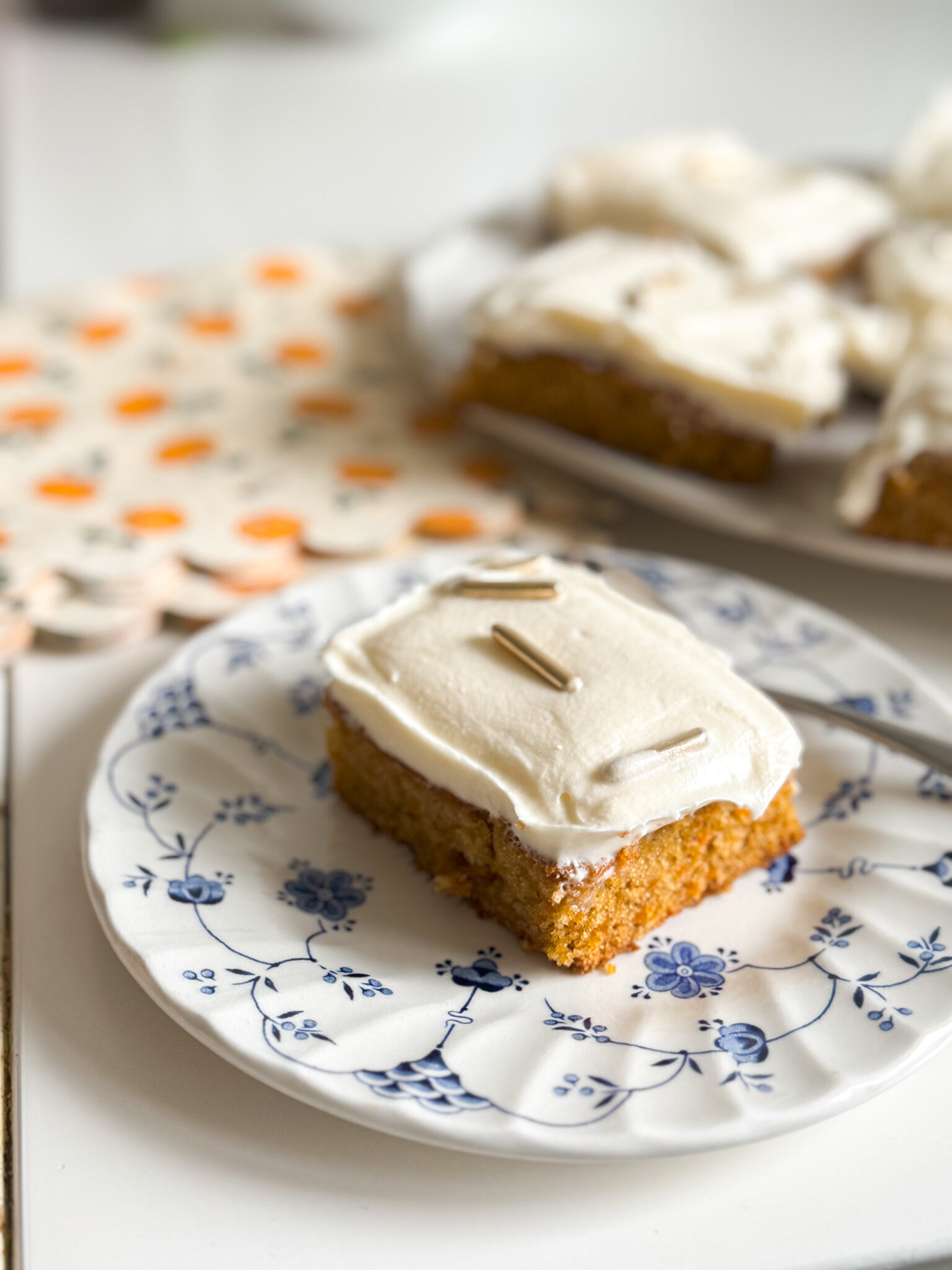 Porkkanapiirakka. Minulle se tuo heti mieleen lapsuuden. Meidän Sipoon kodin pienen keittiön, jossa korkeista ikkunoista paistoi aurinko sisään. Ikkunoita reunusti meidän äidin siniset lehmäverhot. (Kyllä, luit oikein.) Porkkanapiirakka oli mehevää, pehmeää ja kuorrute suorastaan suli suuhun. Minulle tämä muisto on äärimmäisen selvä ja palaan tähän aina, kun mietin porkkanapiirakkaa.