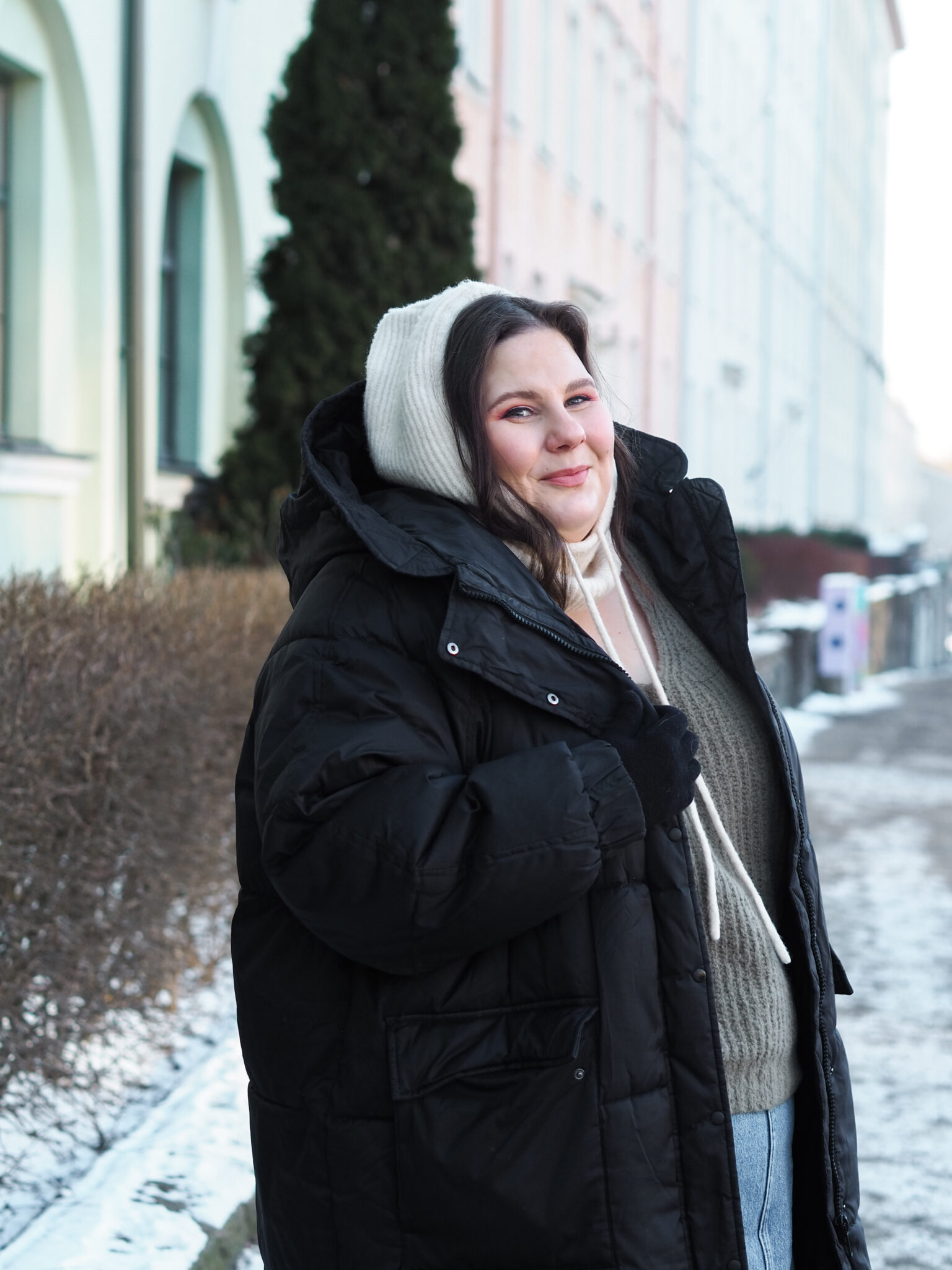 Rakastan mekkoja ja hameita ja mietin usein, miten saisin käytettyä niitä myös talvella. Tämä yhdistelmä oli mielestäni tosi kiva. Nansolta markkinointitarkoituksessa saatu neule sopii todella hyvin viime kesänä ostamaani farkkuhameeseen. Olen esitellyt tuon kyseisen hameen vaatteena, jonka meinasin palauttaa sen vuoksi, että mahani näkyy siinä. Sitten totesin taas, että mitä väliä. Kuten Sannalovesfood IG:ssä sanoo: Sun maha ei pilaa sun asua. 🩷 Joten hame sai jäädä ja olen ollut siitä iloinen.