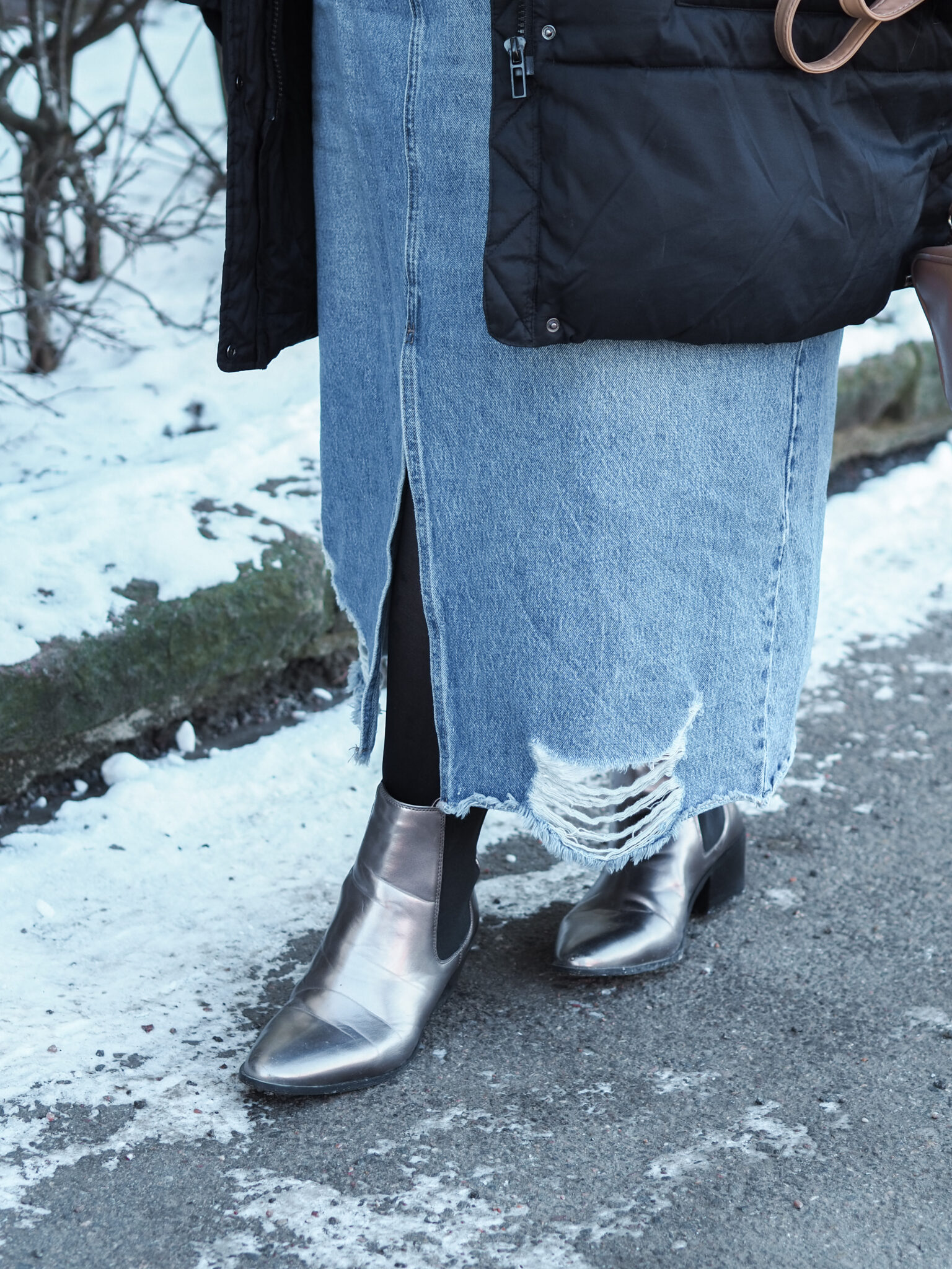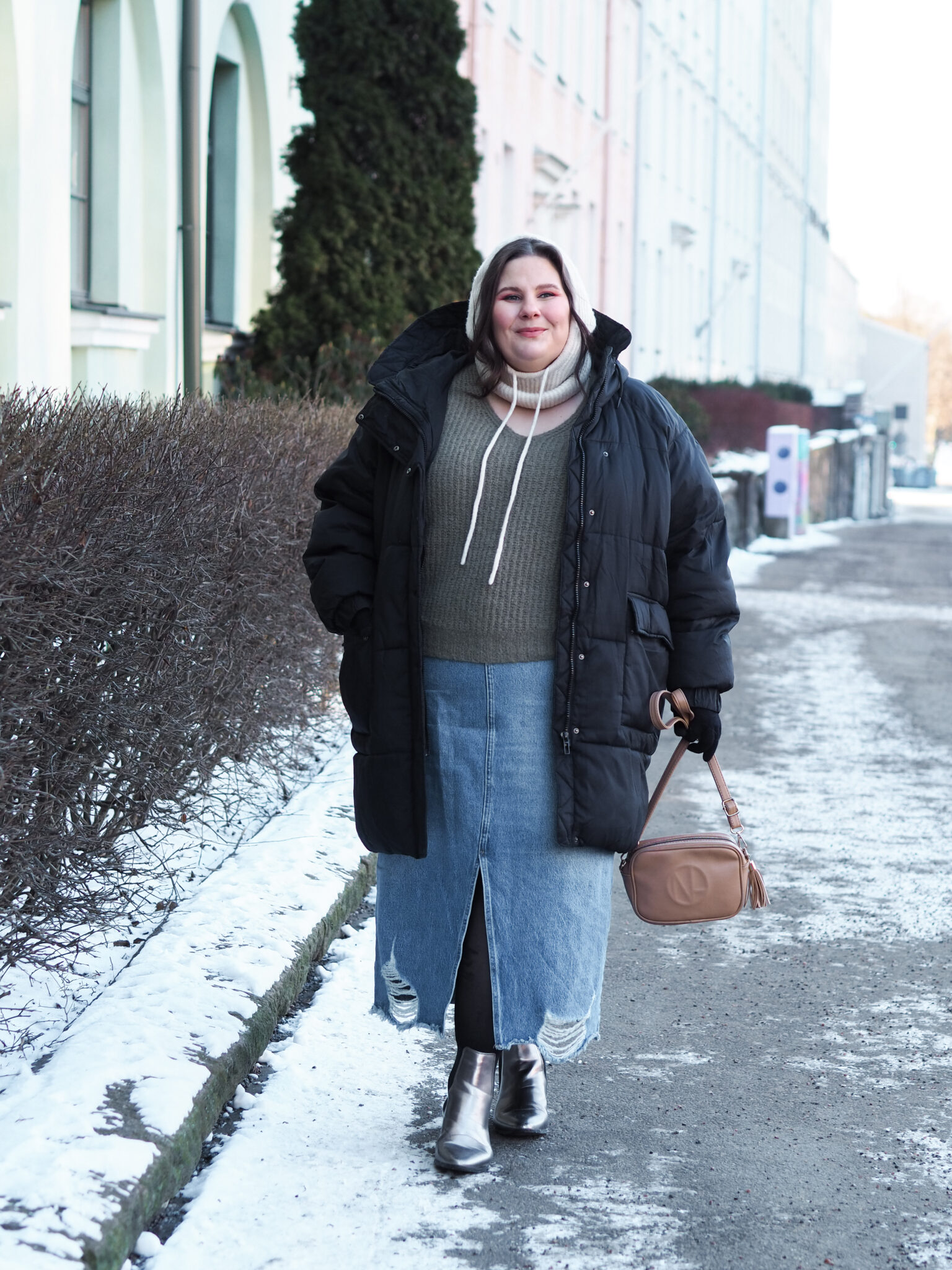 Rakastan mekkoja ja hameita ja mietin usein, miten saisin käytettyä niitä myös talvella. Tämä yhdistelmä oli mielestäni tosi kiva. Nansolta markkinointitarkoituksessa saatu neule sopii todella hyvin viime kesänä ostamaani farkkuhameeseen. Olen esitellyt tuon kyseisen hameen vaatteena, jonka meinasin palauttaa sen vuoksi, että mahani näkyy siinä. Sitten totesin taas, että mitä väliä. Kuten Sannalovesfood IG:ssä sanoo: Sun maha ei pilaa sun asua. 🩷 Joten hame sai jäädä ja olen ollut siitä iloinen.