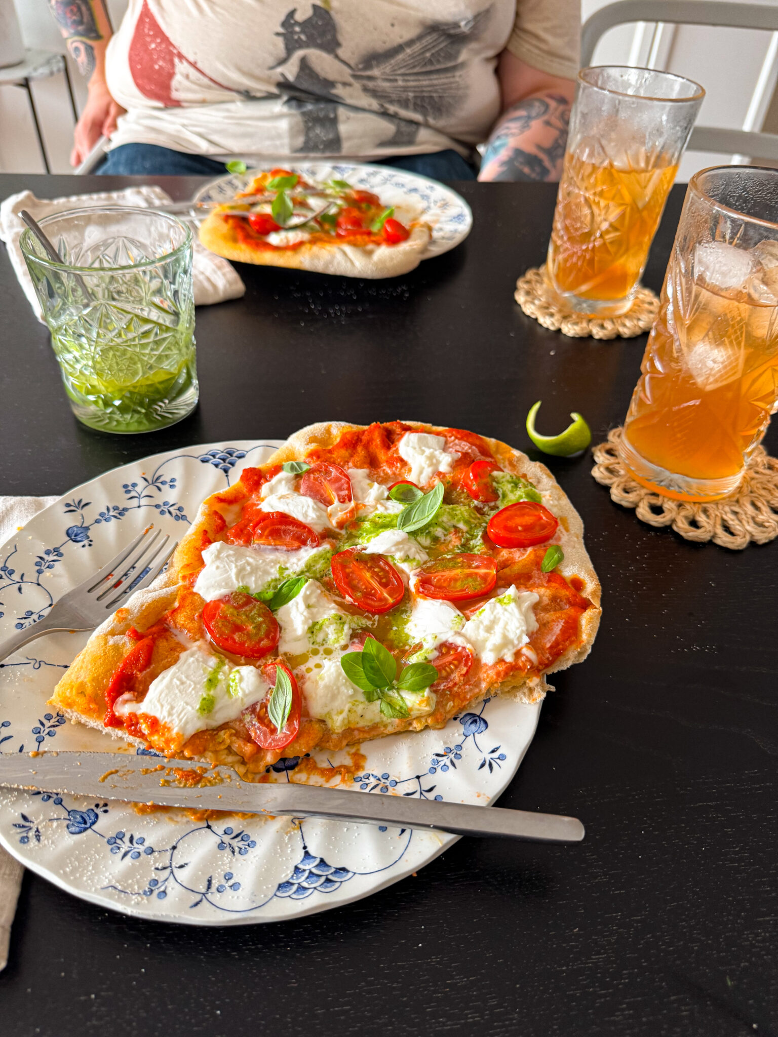 Pääruuaksi Totte taiteili meille pinsat ja nämä oli ihan uskomattoman hyviä. Tehtiin tällä samalla kaavalla pinsat myös meidän synttäribrunssille. Bongattiin tämä alunperin Instagramista @saralindholm-tililtä. Tässä versiossa parasta on ehdottomasti tuo aivan ihana basilikaöljy. 🤤
