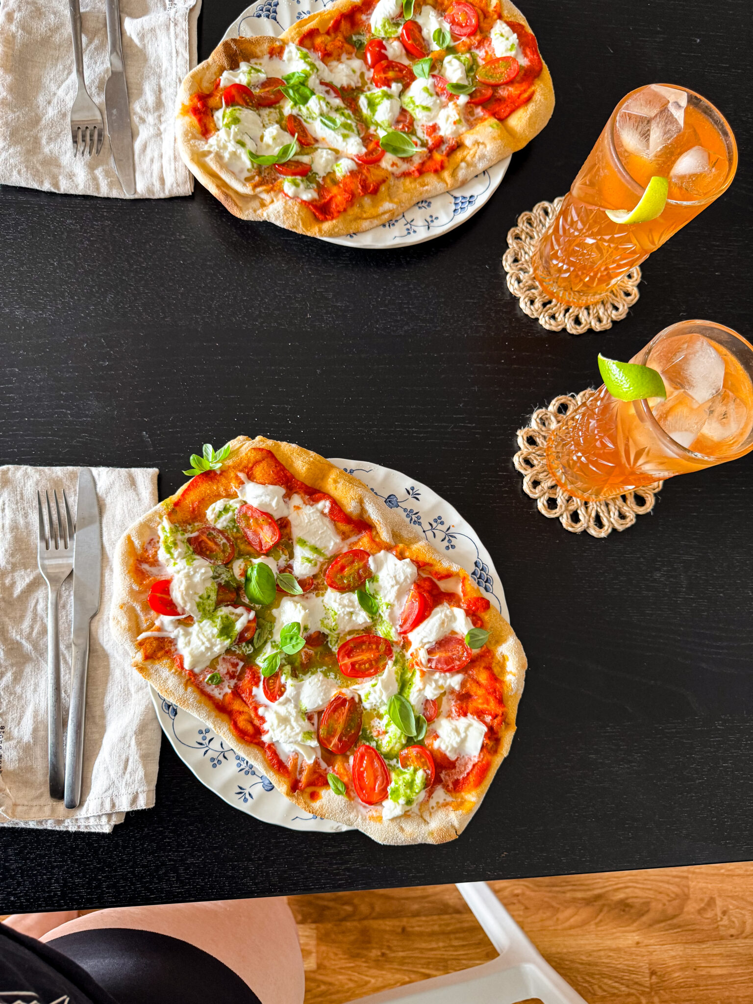 Pääruuaksi Totte taiteili meille pinsat ja nämä oli ihan uskomattoman hyviä. Tehtiin tällä samalla kaavalla pinsat myös meidän synttäribrunssille. Bongattiin tämä alunperin Instagramista @saralindholm-tililtä. Tässä versiossa parasta on ehdottomasti tuo aivan ihana basilikaöljy. 🤤