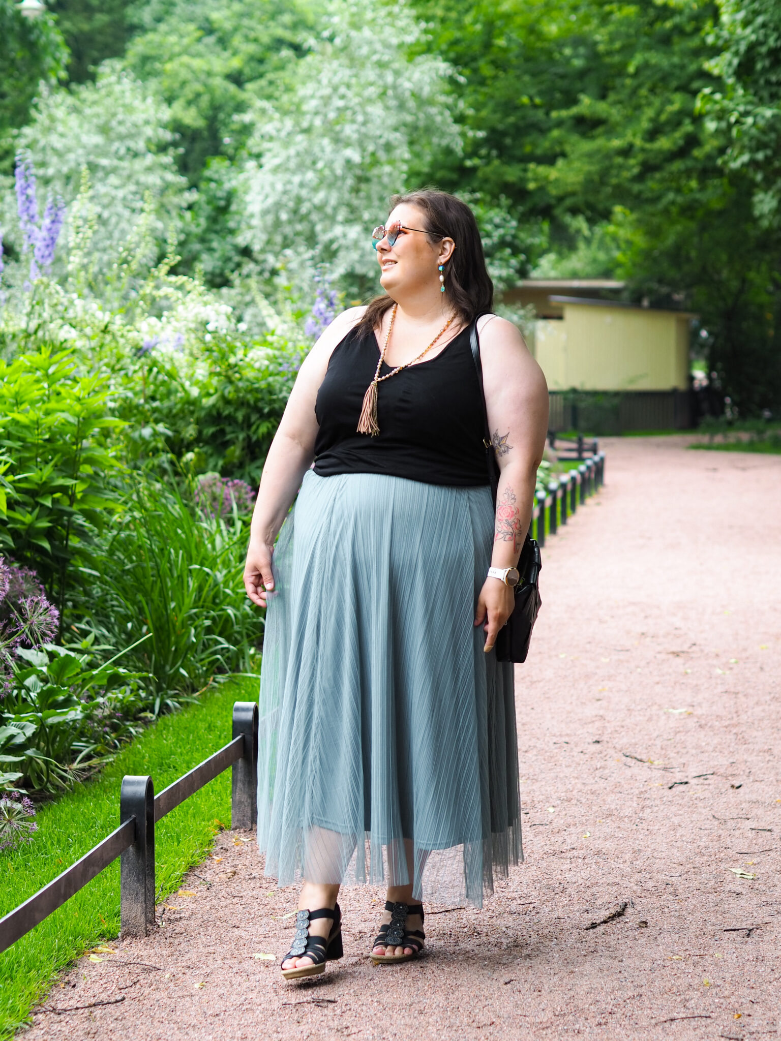 Vaikka oman kehon kanssa on välillä vaikeaa, niin ainakin tuo hame on ihan äärimmäisen kaunis. Se liikkuu kauniisti päällä ja sopii moneen tilanteeseen. Suosikkiyhdistelmäni on tämä hame ja musta toppi.