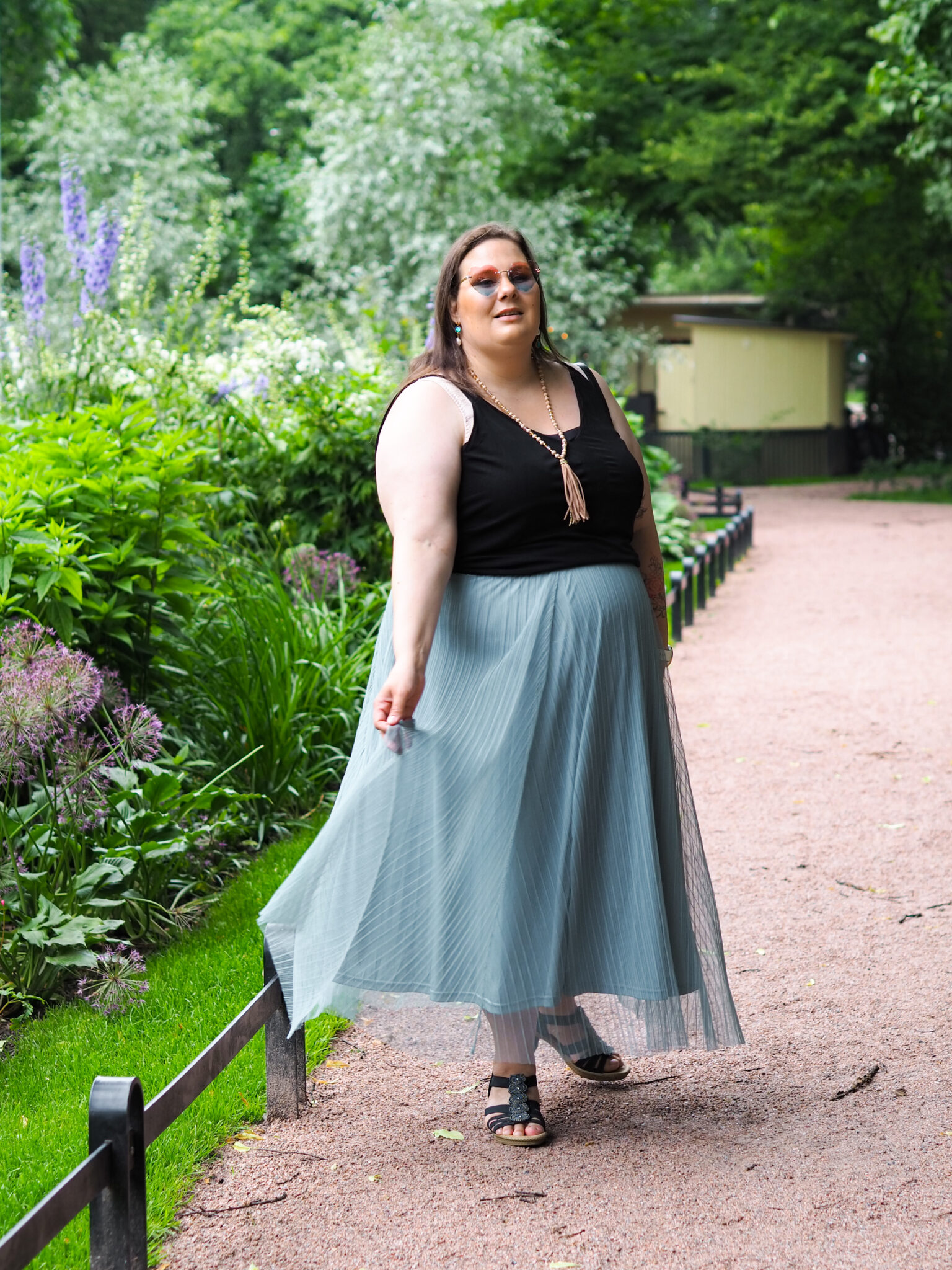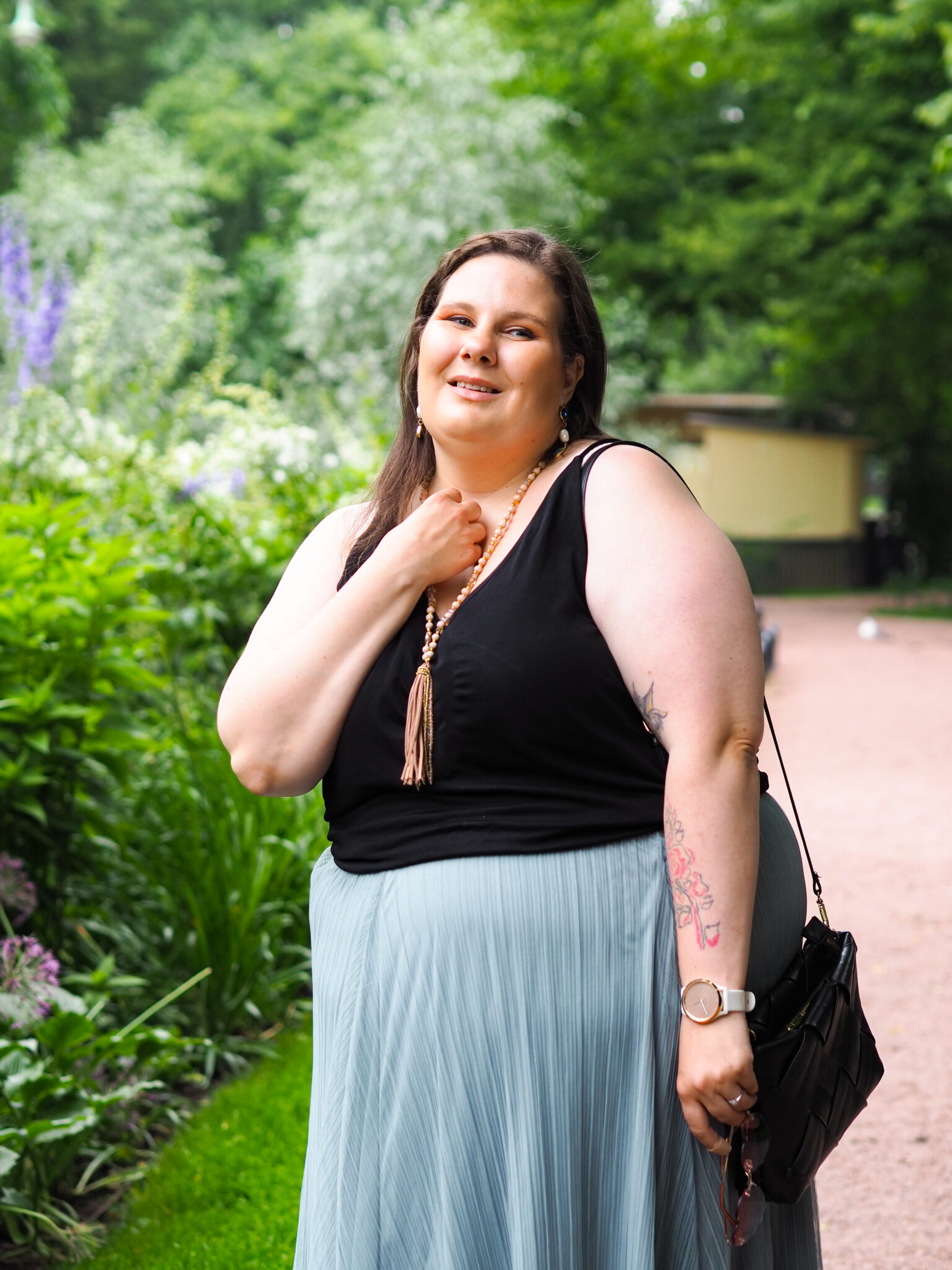 Vaikka oman kehon kanssa on välillä vaikeaa, niin ainakin tuo hame on ihan äärimmäisen kaunis. Se liikkuu kauniisti päällä ja sopii moneen tilanteeseen. Suosikkiyhdistelmäni on tämä hame ja musta toppi.